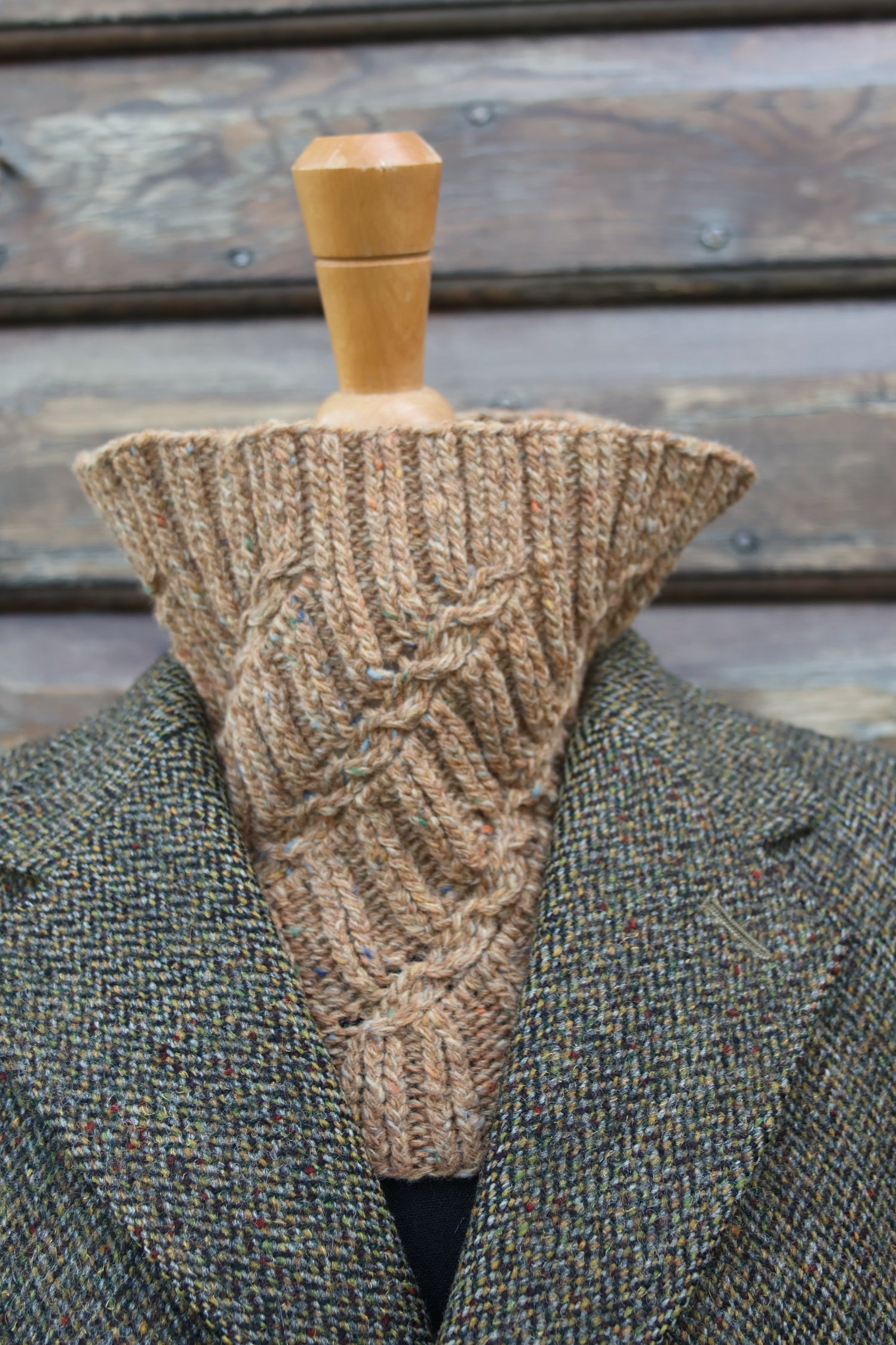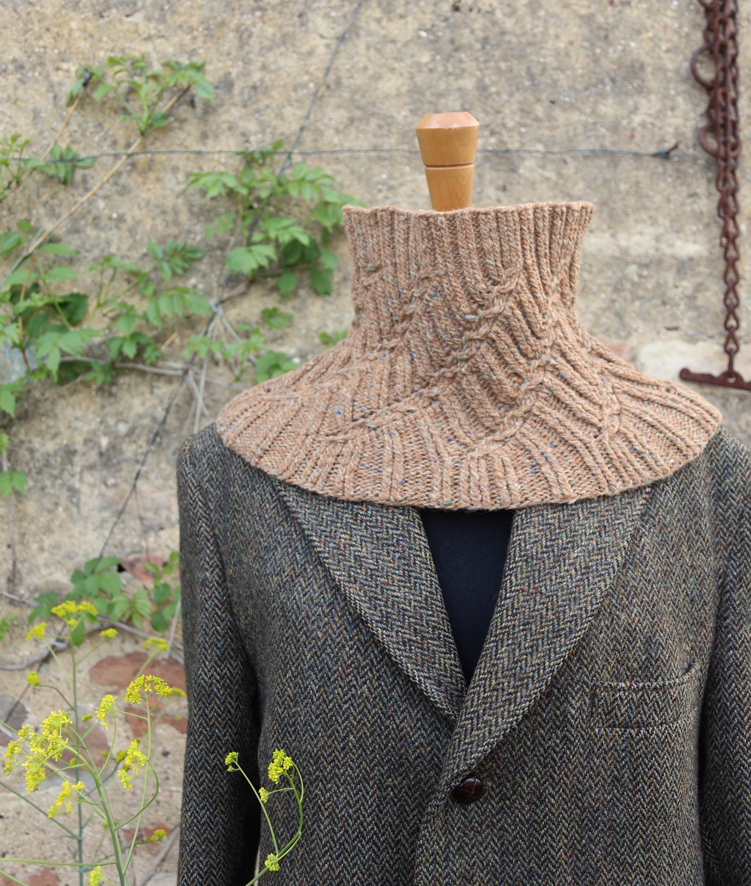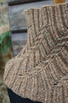 The Verna Cowl arose from an exploration of twisted stitches in sock designs, and a desire to see them scaled up a little. Attracted to the crisp three dimensional structure that twisting the stitches produces, and how they stand proud against a background, I wanted to explore how they could create direction, texture and importantly for one of my favourite shapes of cowl, structure.