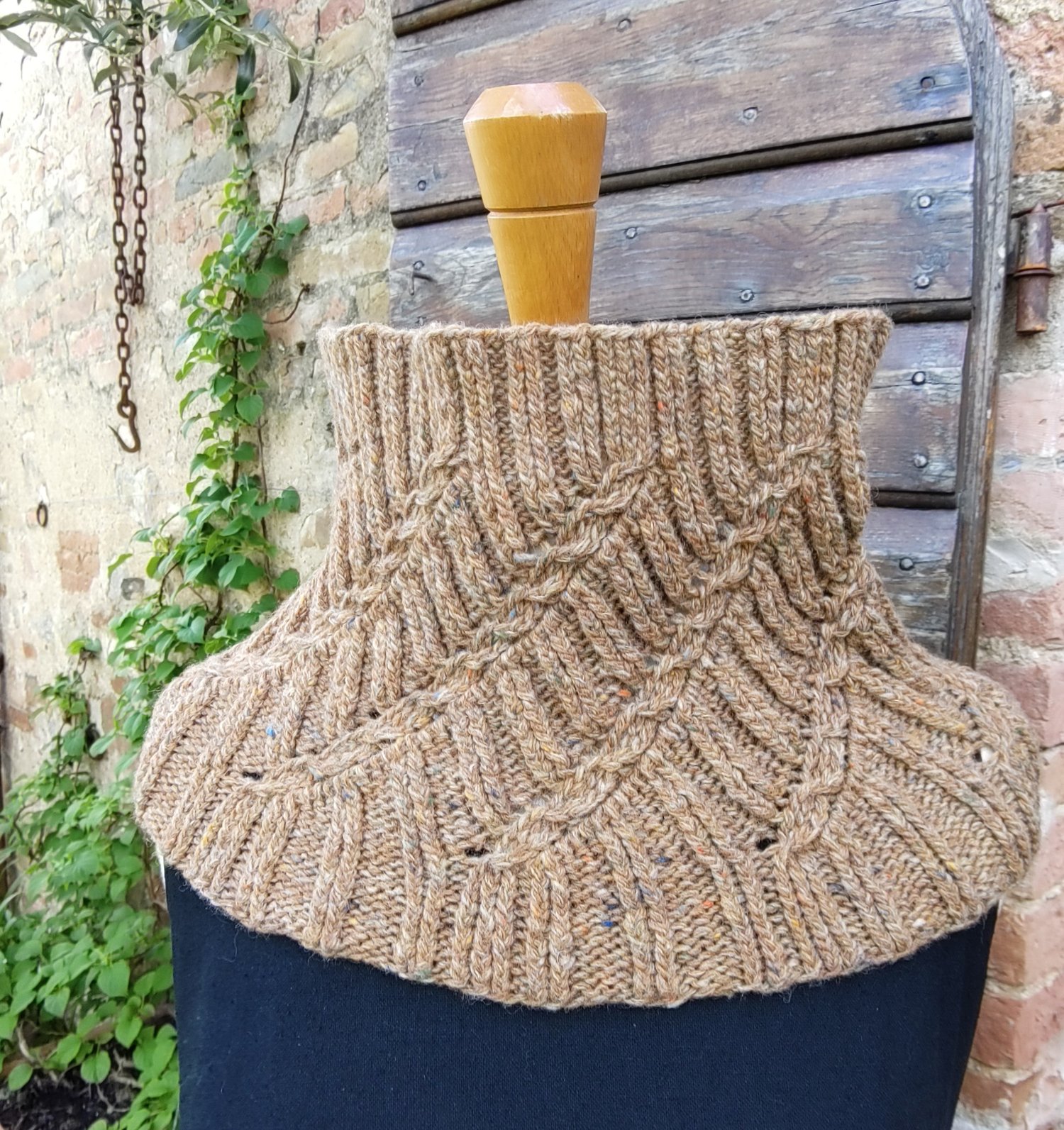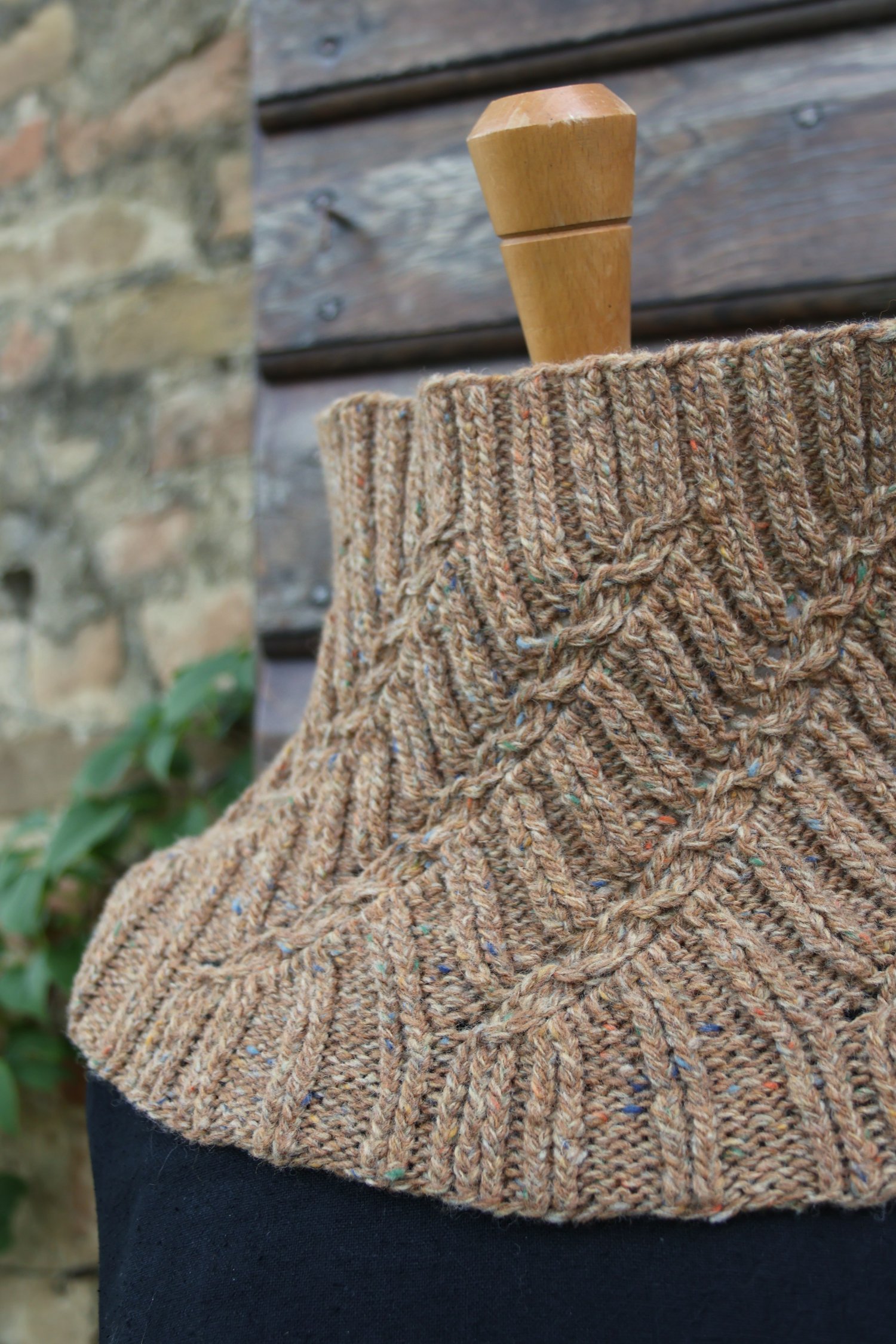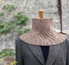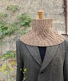 Verna is knit in the round starting from the bottom rib, working through the bias pattern section, to the top rib. The shaping is achieved through both changing needle sizes and decreasing the number of stitches. This creates a cowl that sits nicely on the shoulders and closes in around the neck for maximum warmth and cosiness. It is also the perfect shape for a slightly open fronted coat or jacket with which you can also admire the pattern detail of the cowl to its fullest.