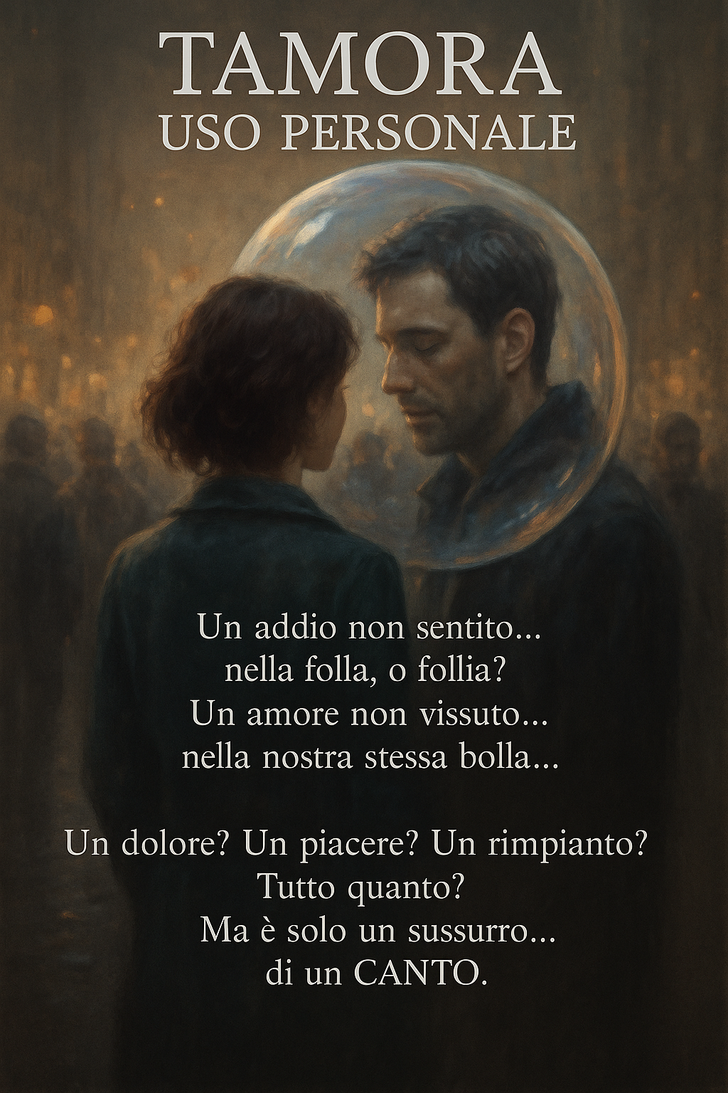 “Sussurro di un Canto” è una cartolina digitale fotorealistica che unisce poesia e immagine per raccontare le sfumature dell’animo umano. Questa edizione speciale, protetta con la dicitura “TAMORA – Uso Personale” (diritti riservati), presenta versi toccanti che esplorano solitudine, desiderio e speranza: