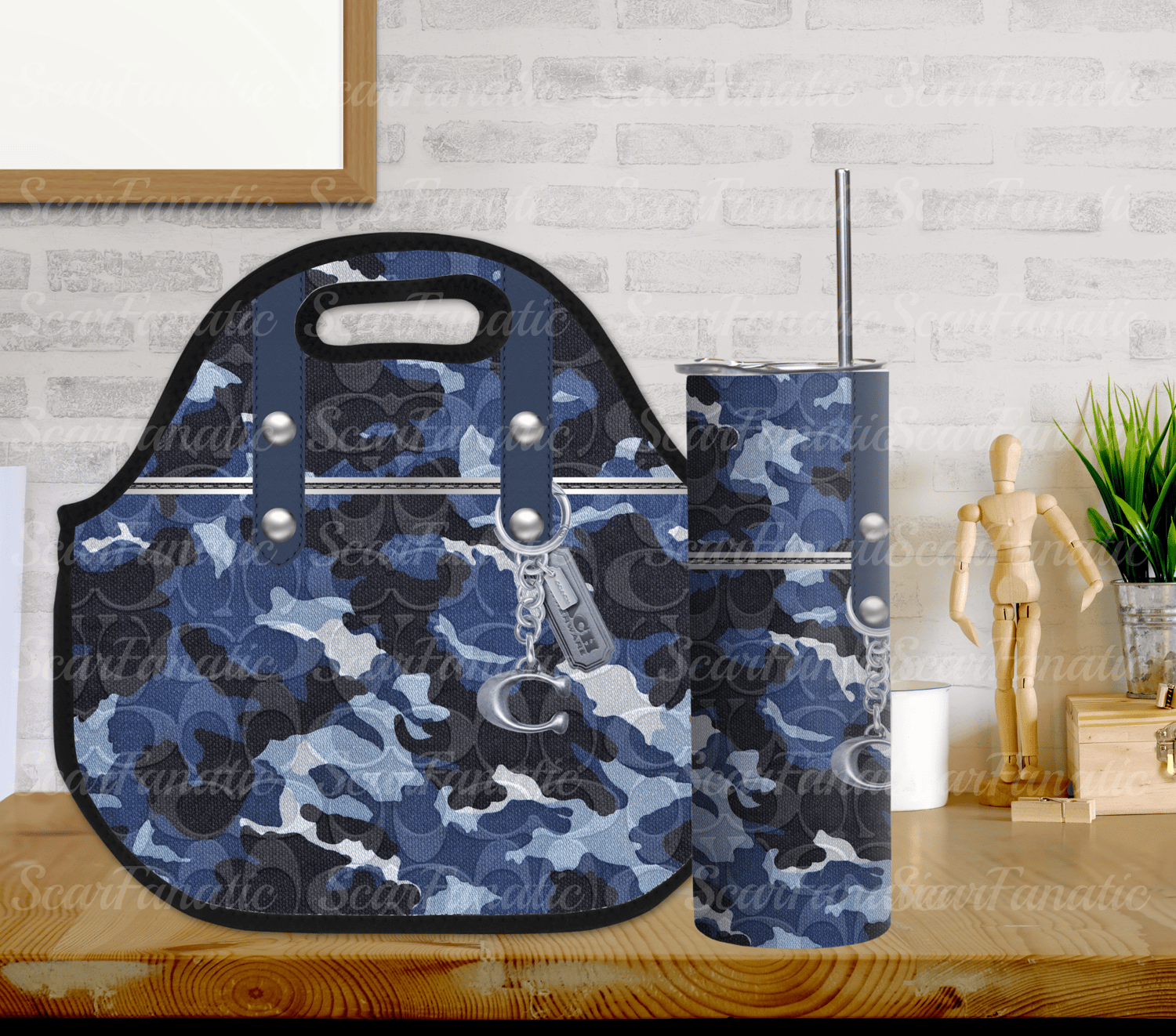 Denim and Leather Blue Grey and White Camouflage Purse Look 20oz Skinny Tumbler and Lunch Tote Design PNG Bundle