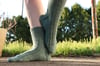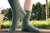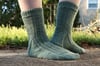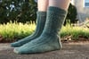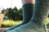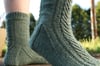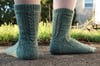 Silver Fir Socks feature a central cabled panel reminiscent of evergreen branches. A smaller version of the cable runs along the back leg and tapers to a point midway through the heel flap. Garter stitch details add to the texture, and stockinette panels along the sides allow for easy customization, with the hard work already done for you on 5 sizes. Choose a solid or semi solid yarn to allow the texture to pop!