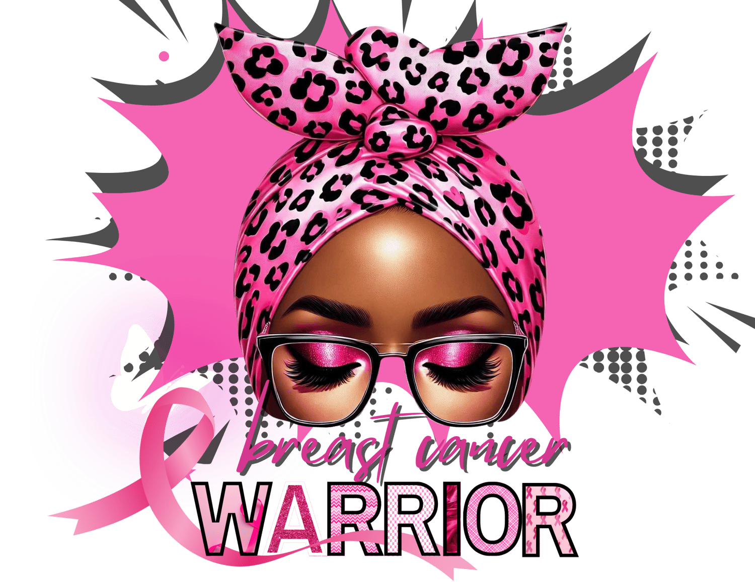Celebrate your strength and resilience with this inspiring digital image. A powerful symbol of hope and courage, this vibrant pink artwork features a woman with a determined headband, standing tall against a backdrop of pink splashes.