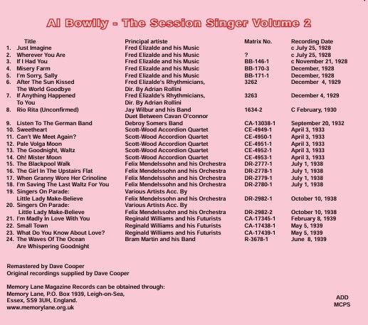 The is the second of two releases featuring recordings Al Bowlly made as a guest in various bands in the studio. Some very rare releases here. Some of the Elizalde, Scott-Wood and Williams 78s command very high prices in the original 78rpm format. Enjoy these for a fraction of the cost all gathered together for the first time.