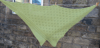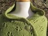 Ostara the shawl begins at the bottom left hand angle of a square and increases along the diagonal, the hypotenuse, with two halves of very different patterning, reflecting the equality of night and day. As it slowly grows, the leaves emerge along one edge and flowers begin to dot one half of the shawl. Folded along the centre spine it forms a warm layered shawl, opened out it becomes a lighter airy accessory for sunnier Spring days. I have chosen a lovely blend of wool and silk for this shawl, in a vibrant Spring green. Ostara can be blocked as a square, a rectangle, or a parallelogram. It can be worn in several ways: folded as a triangle along the diagonal centre stitch to show the flower side or the garter side; folded as a triangle across the diagonal to show one half flowers and one half garter; folded across the middle to make a narrower rectangle.