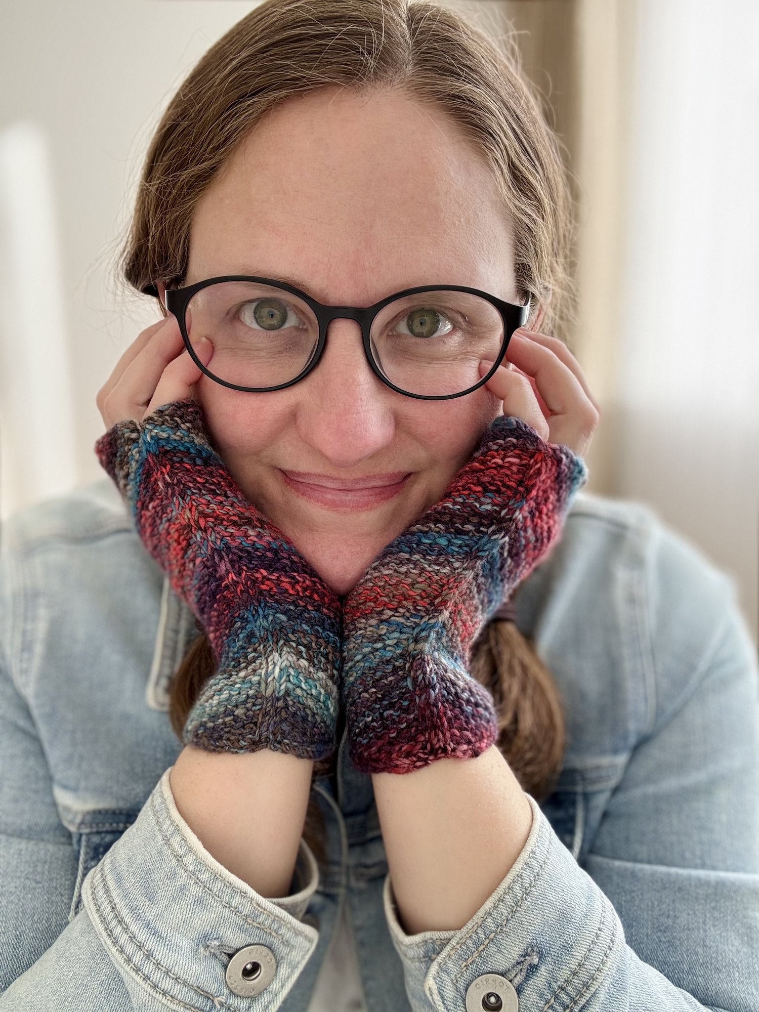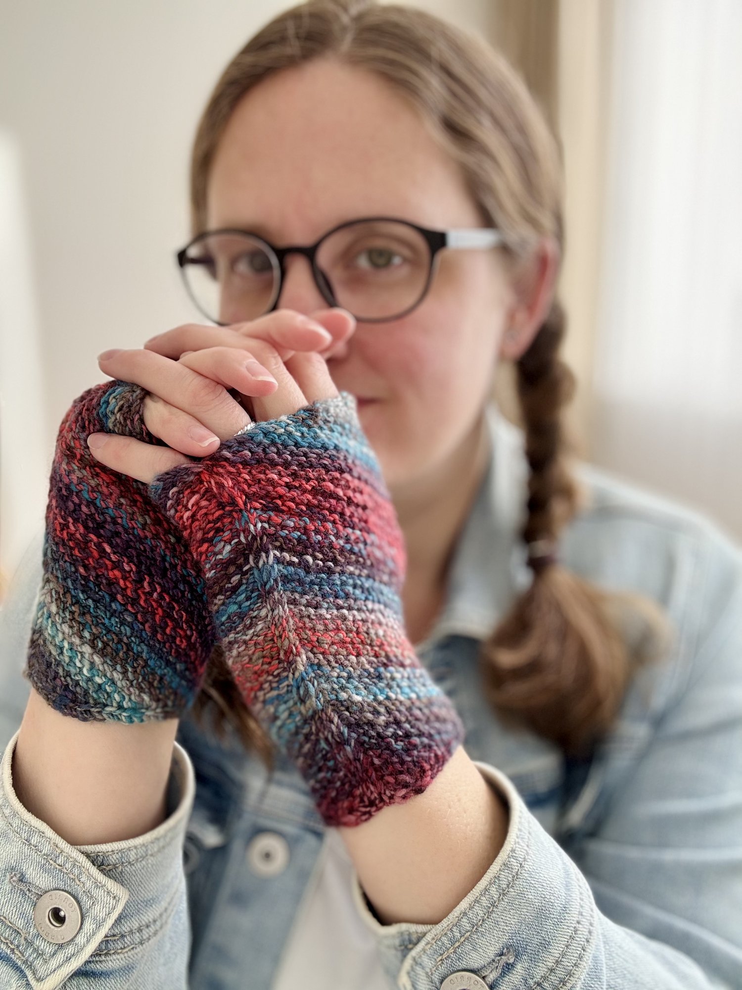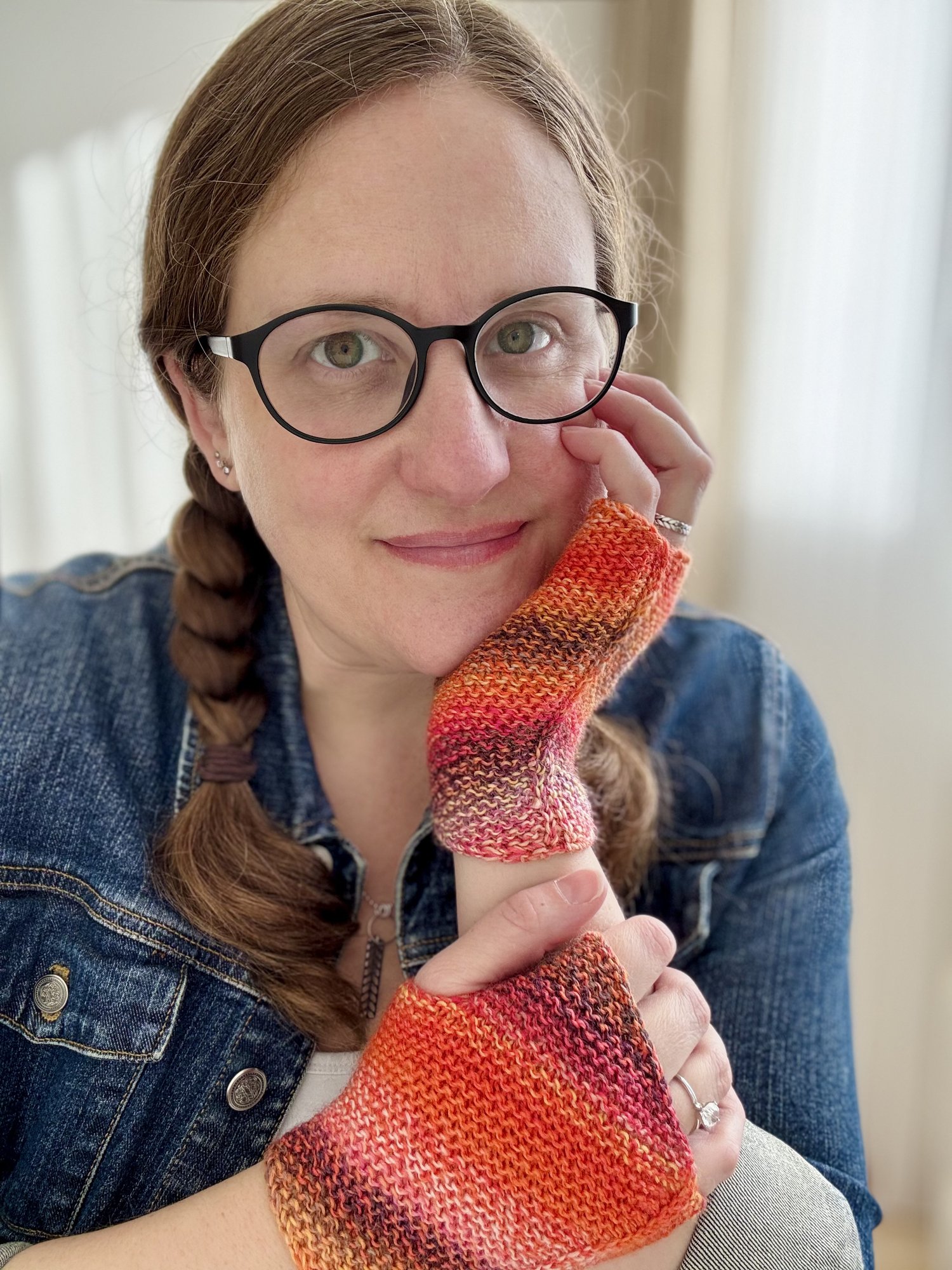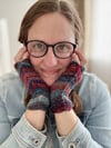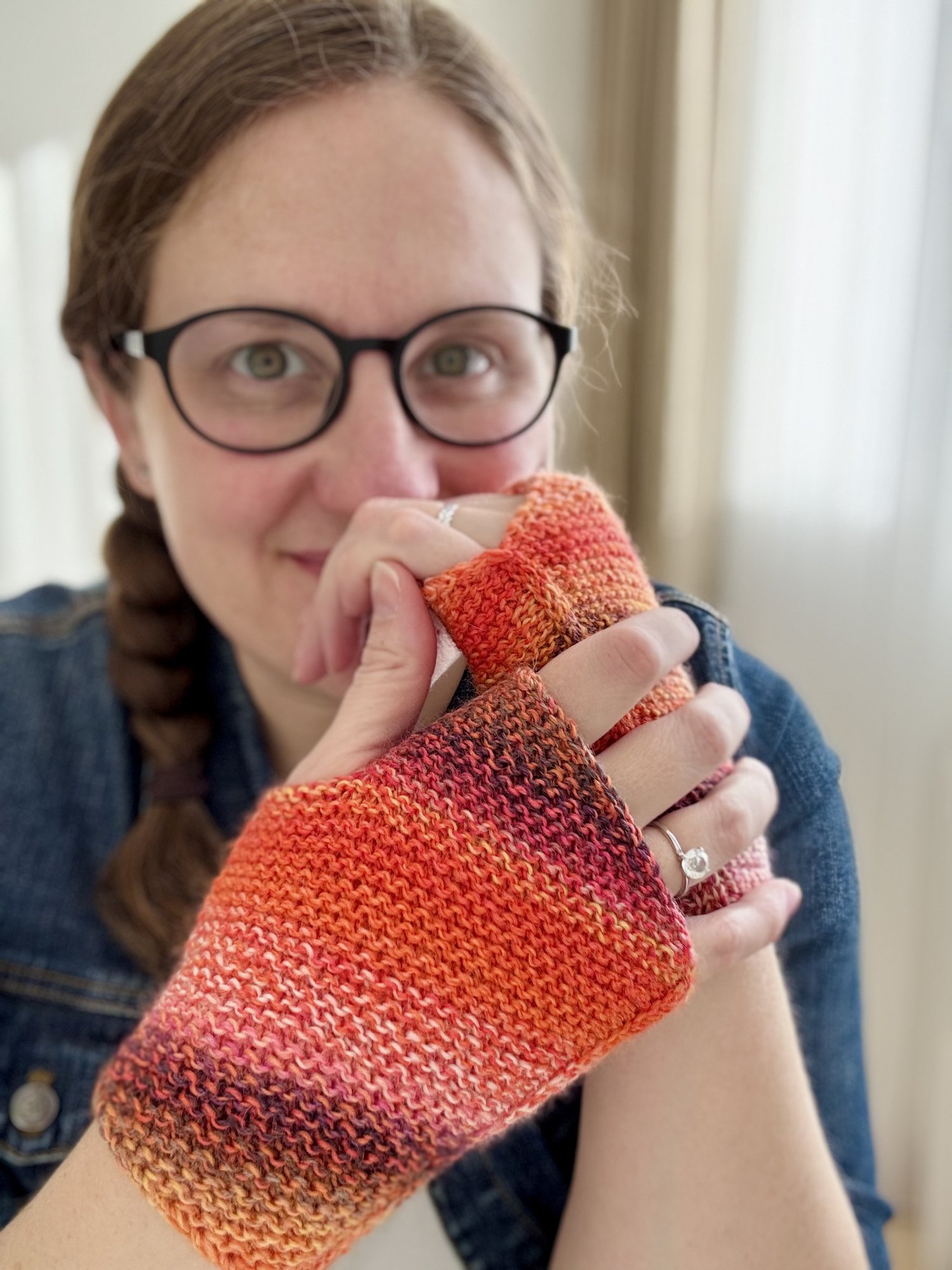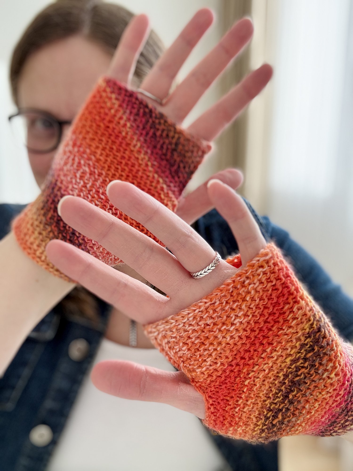 Bias-knit garter stitch fingerless mitts with an integrated thumb gusset