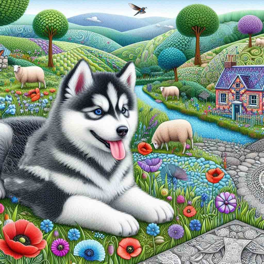 Beautiful Siberian Husky pup on patterned hills beside a big pond. There are flowers, cottages & sheep.