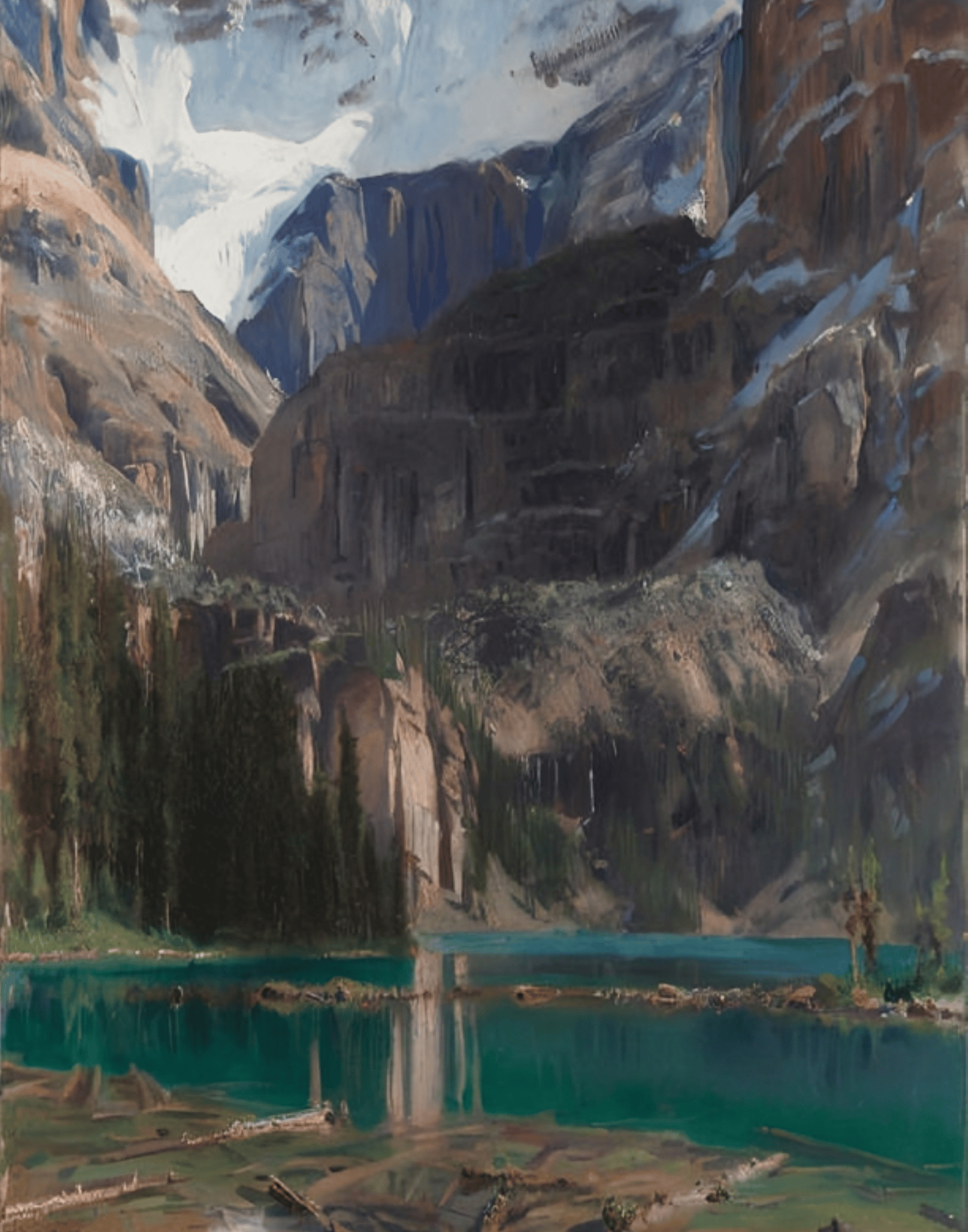 Ancient Lake, Mountainous Serene Lake Painting, Vintage Landscape, Nostalgic Nature, Cool Nature, Rustic natural Landscape, Painting.