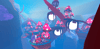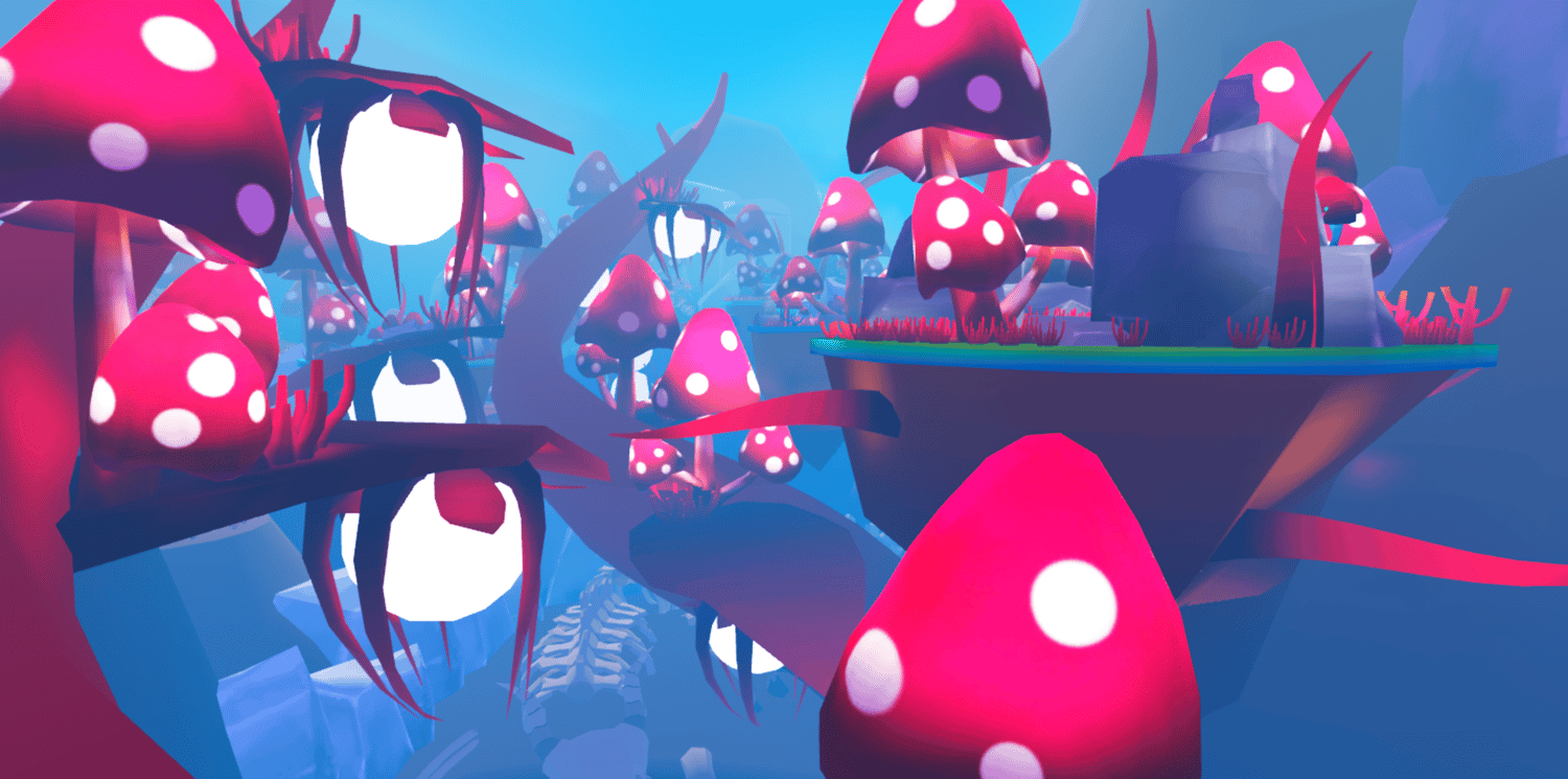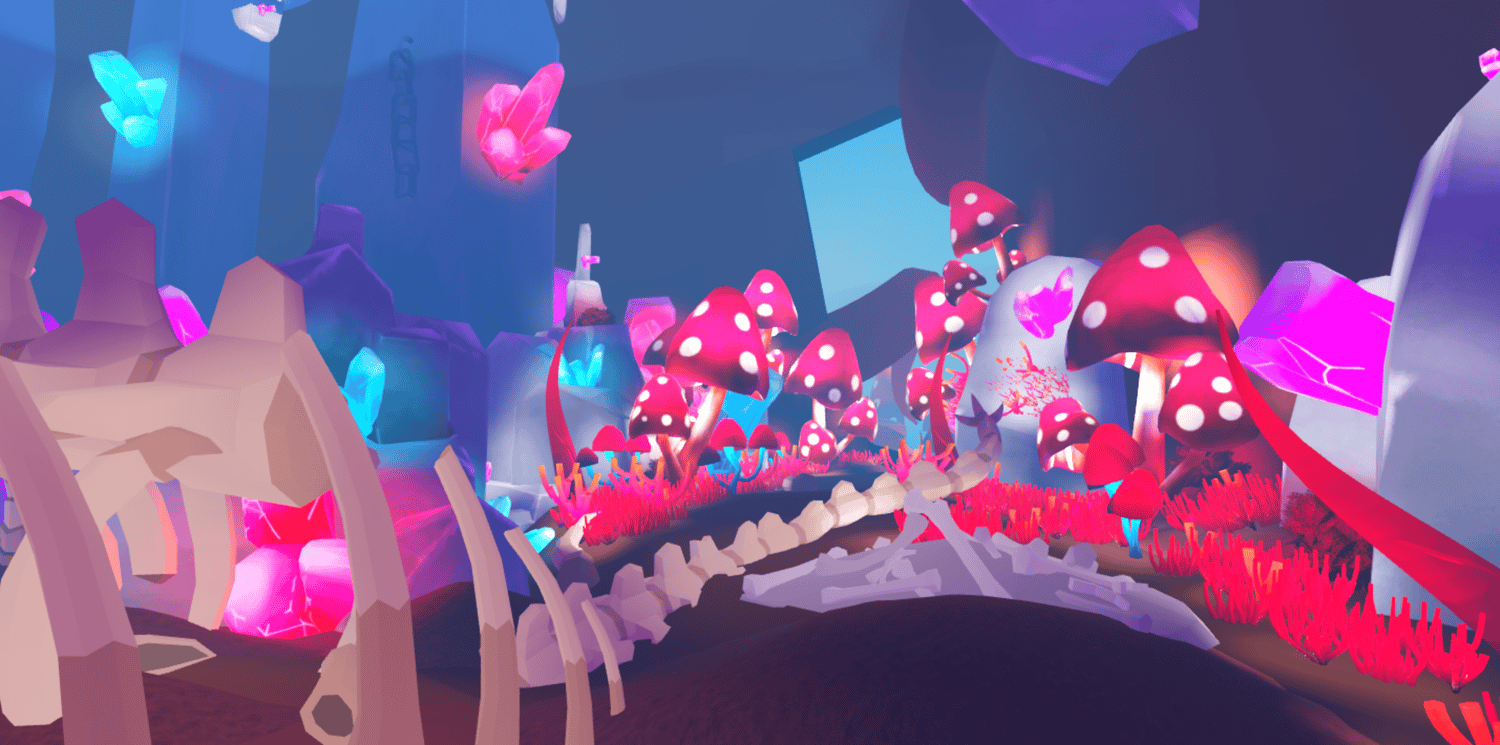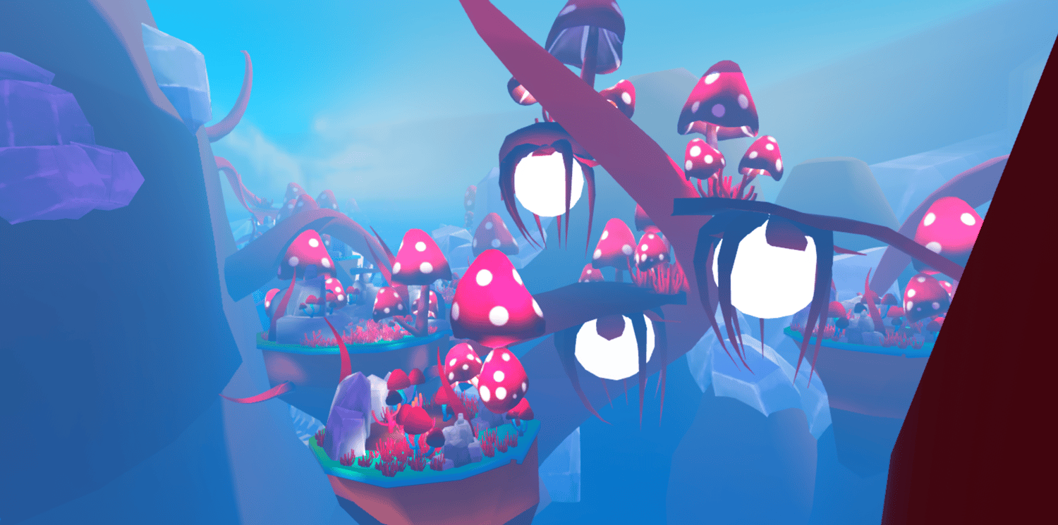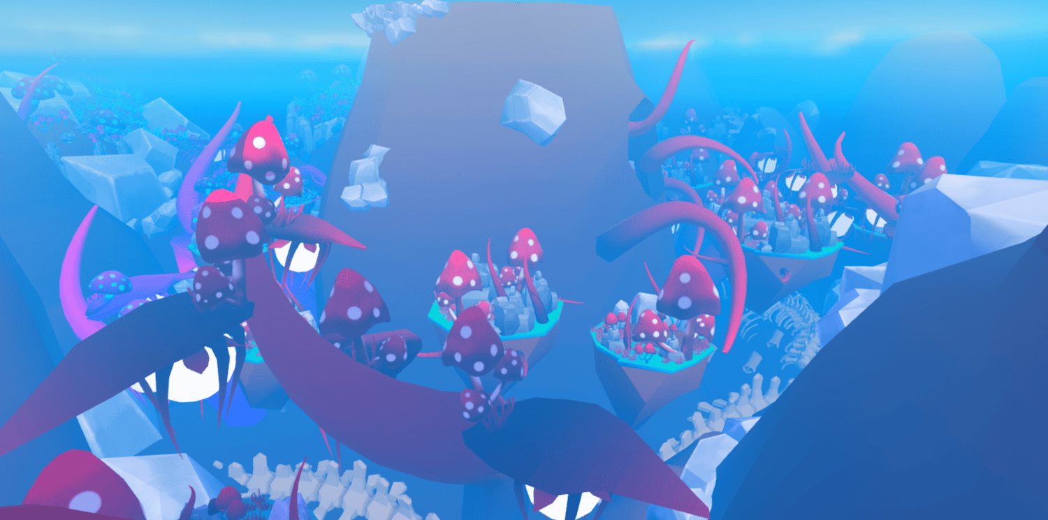 A vibrant underwater fantasy world featuring a surface diving base with glass domes, expansive deep sea zones filled with glowing bioluminescent mushrooms, colorful coral reefs, and massive crystal formations. Floating mushroom platforms, giant skeletal remains, and twisting tendrils create an alien oceanic landscape in vivid pinks, blues, and purples. The surface base includes detailed interiors with diving equipment, supply crates, and a pool entrance to the depths below. Soft atmospheric haze and saturated lighting bring the stylized low poly aesthetic to life. The layout supports exploration across multiple underwater biomes and vertical layers. Perfect for ocean adventure games, exploration experiences, fantasy RPGs, diving simulators, or cinematic showcases.