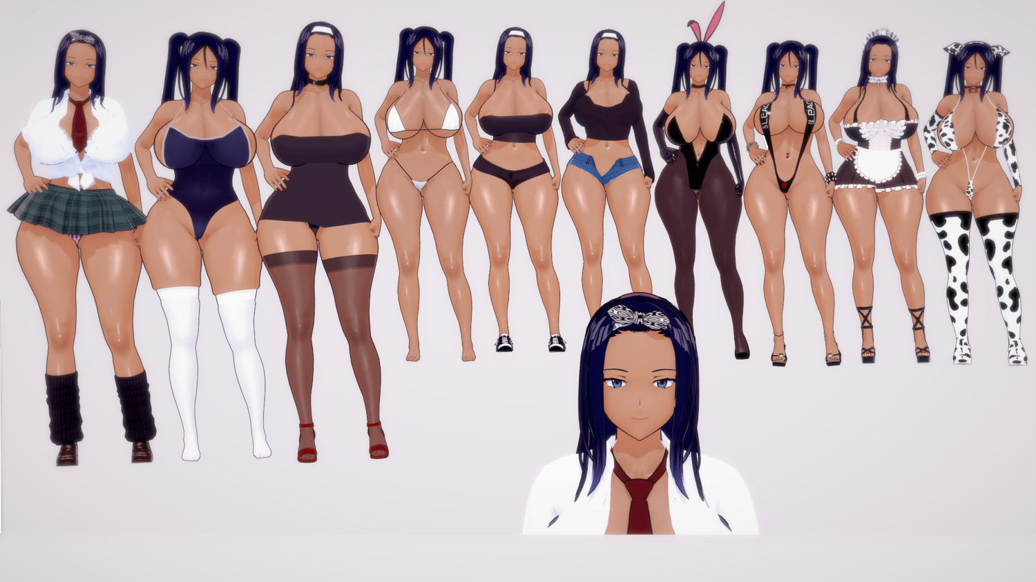 Naomi includes various costumes: normal 1, school swinsuit, formal black, bikini, normal, normal, bunny, black biki, maid, cow.