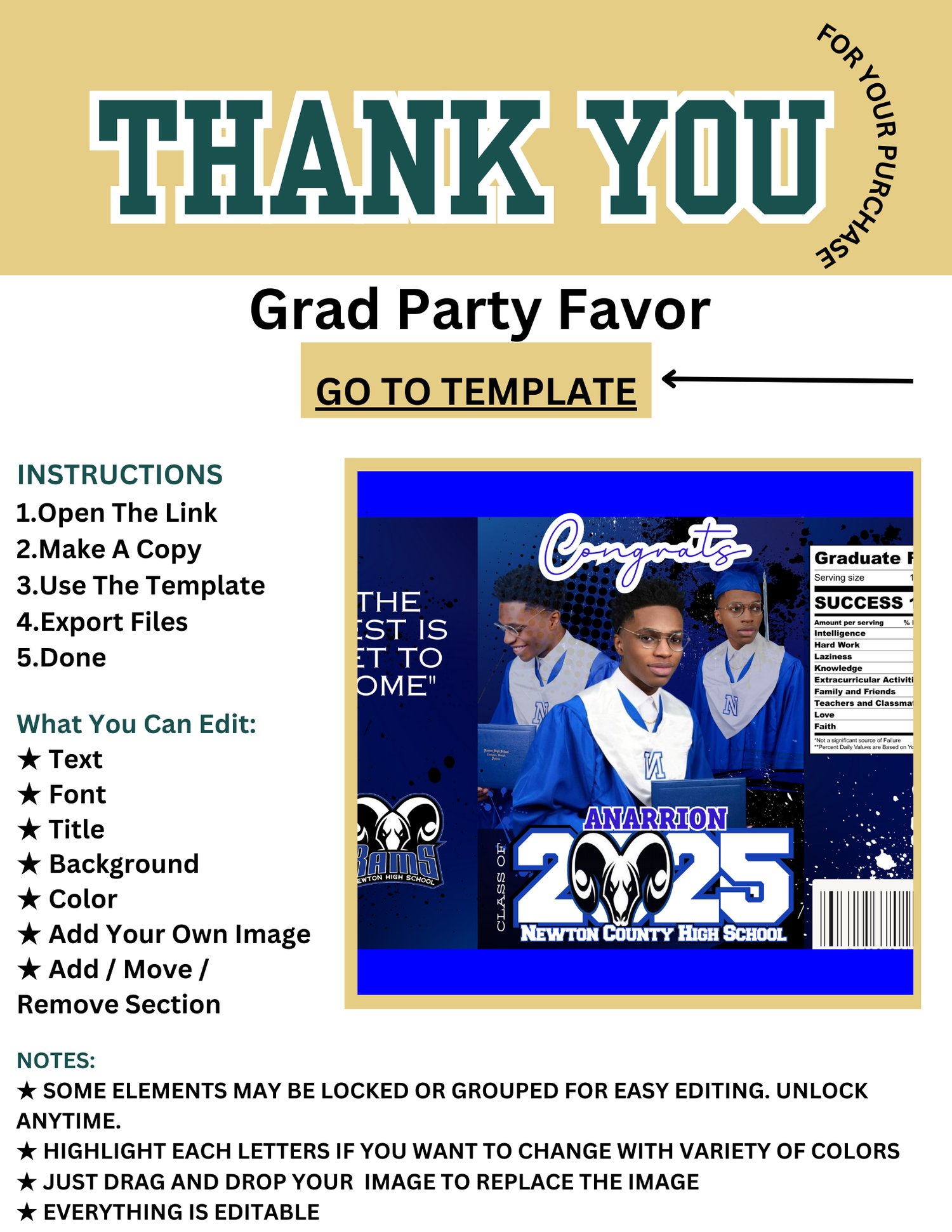 - Fully Editable: Customize text, images, colors, and more. Everything is editable to fit your graduate's theme and style.