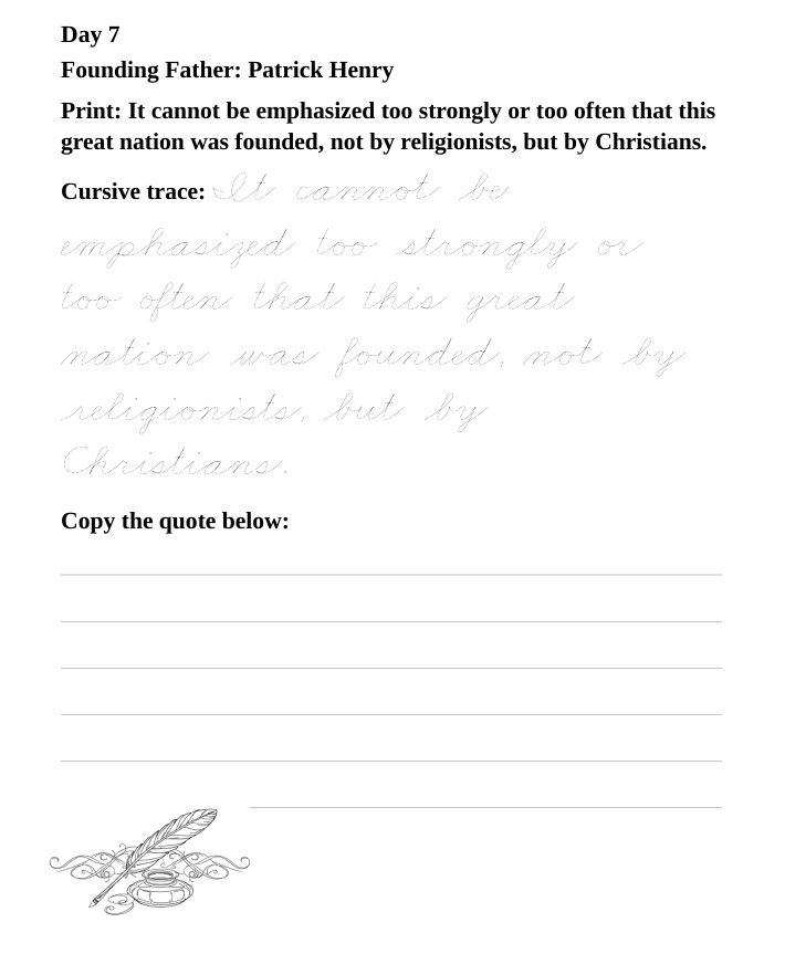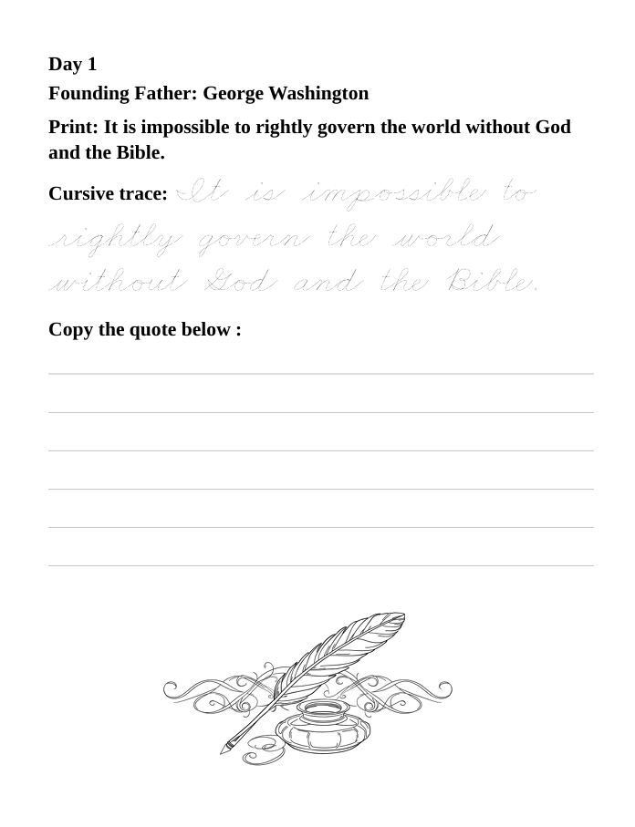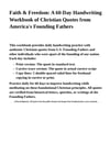 Faith & Freedom is a 60-day handwriting workbook that builds beautiful penmanship while immersing students in the Christian convictions of America’s Founding Fathers. Each day features a verified quote from leaders like Washington, Adams, Jefferson, and Franklin — presented in print and flowing cursive for tracing and copying. Through daily practice, students strengthen handwriting, deepen historical understanding, and discover how biblical faith shaped the soul of the nation. Perfect for homeschool, classroom, or personal study — this workbook turns copywork into a powerful lesson in faith, freedom, and virtue