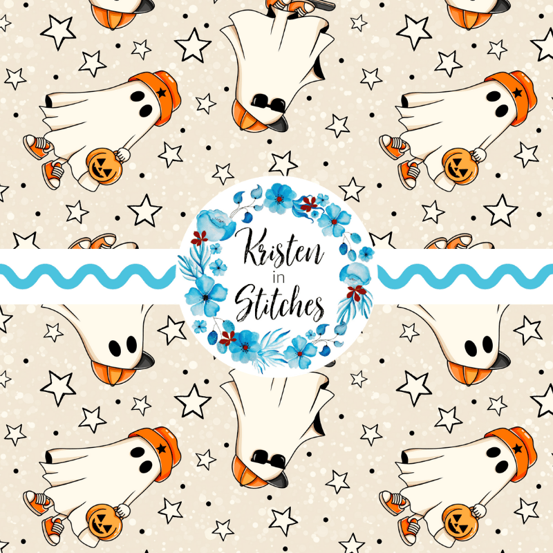 Cool kids skateboarding ghosts with baseball caps, sunglasses, sneakers and pumpkins on ivory.