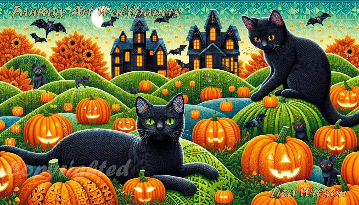 Whimsical Halloween black cats on patterned high hills with haunted houses, glowing pumpkins, beautiful sunflowers & bats silhouetted in a moonlit sky. Spooky fun.