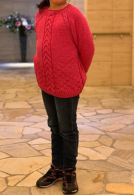 Minecraft sweater is a sweater for kids to teenagers(for adult S size as well). My daughter named it “minecraft” because the block check pattern looks like building blocks. This design is worked from top-down, in the round. The blocks will be build when dividing body and sleeves. The big center cables are also nice element of this sweater design. I am very sure It will be knitted up very quickly.