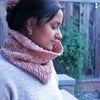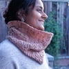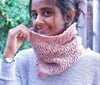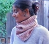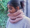 Tuberose Cowl features a twisted stitch motif panel that is repeated on either side of the cowl in the background of a 3X1 ribbing pattern. The stitch pattern itself is be easily memorized and pretty straightforward to knit.