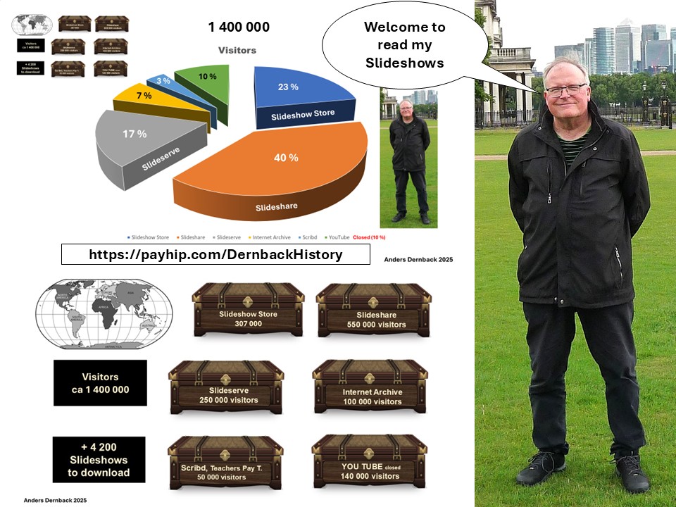 Welcome to search and watch slideshows on the subject of history. I became interested in the subject in 1972 and have read and bought books and borrowed books since then. By 1999 I had learned the computer program Power Point and have made about 10,000 over the years. The combination of a burning interest in history has resulted in a database and collection of slideshows that beats all others made by a single private person. I know because I have researched Globally what there is to compare with. In design, in number and more. I have not been able to find anything comparable. If you find it, contact me soon.