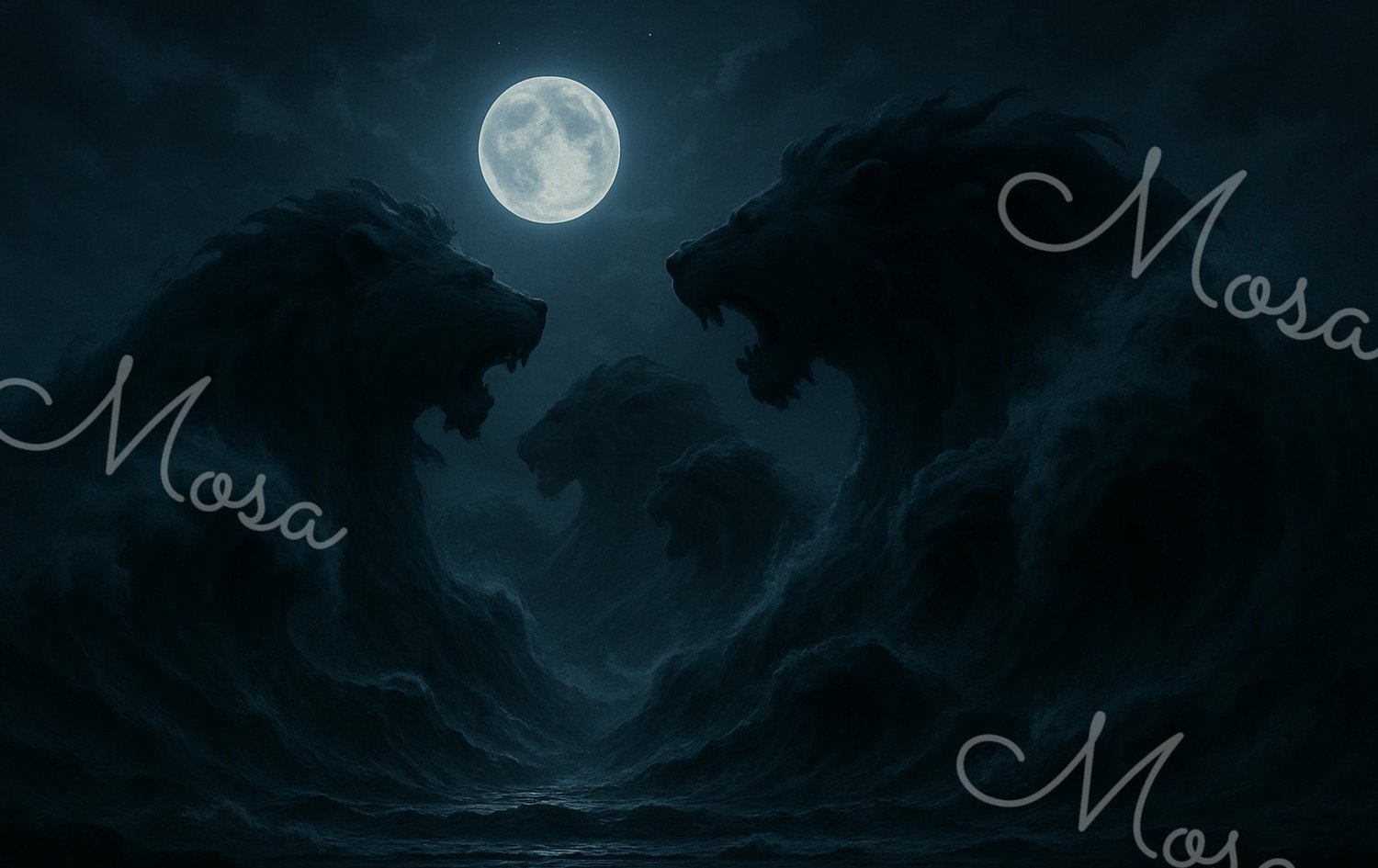 Witness the final moment of judgment in "Divine Collapse", a high-resolution digital artwork capturing the exact second when the parted sea crashes down upon Pharaoh’s army. Continuing the epic narrative of the mysterious ninja’s confrontation, this piece unleashes the fury of the ocean as towering waves - shaped like shadows of beasts -descend with unstoppable force.