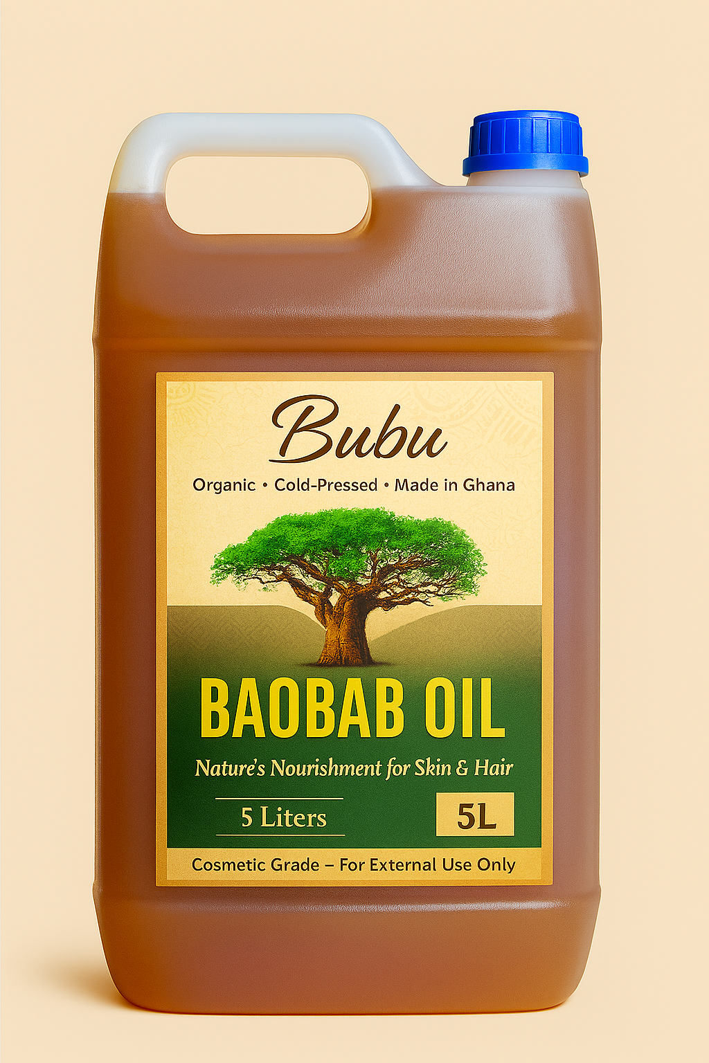 Bubu Baobab Oil is a premium, cold-pressed oil sourced directly from Ghana’s iconic baobab tree. Rich in omega fatty acids, antioxidants, and vitamins, this golden oil deeply nourishes skin and hair while honoring African wellness traditions. Lightweight and fast-absorbing, it’s perfect for use as a facial serum, scalp treatment, massage oil, or natural remedy for stretch marks and dryness.