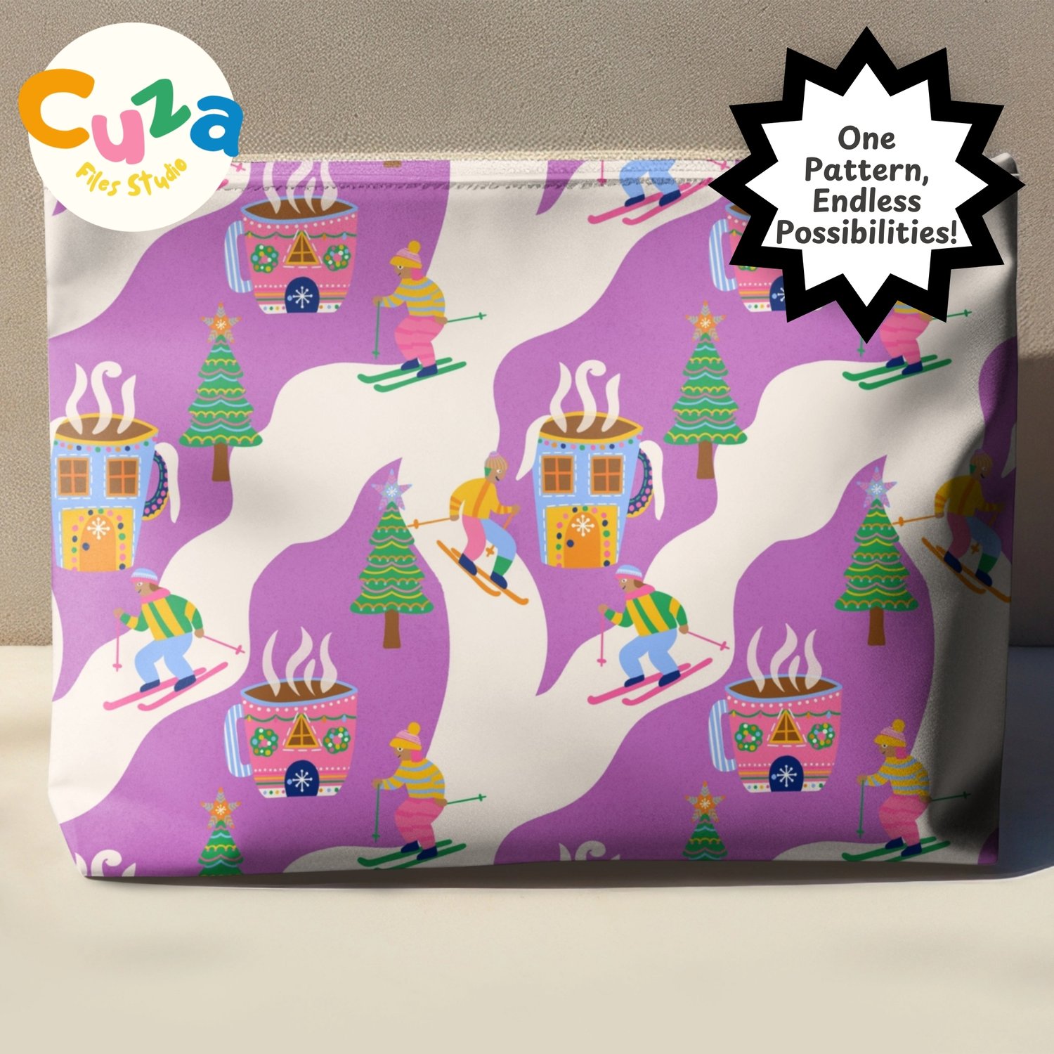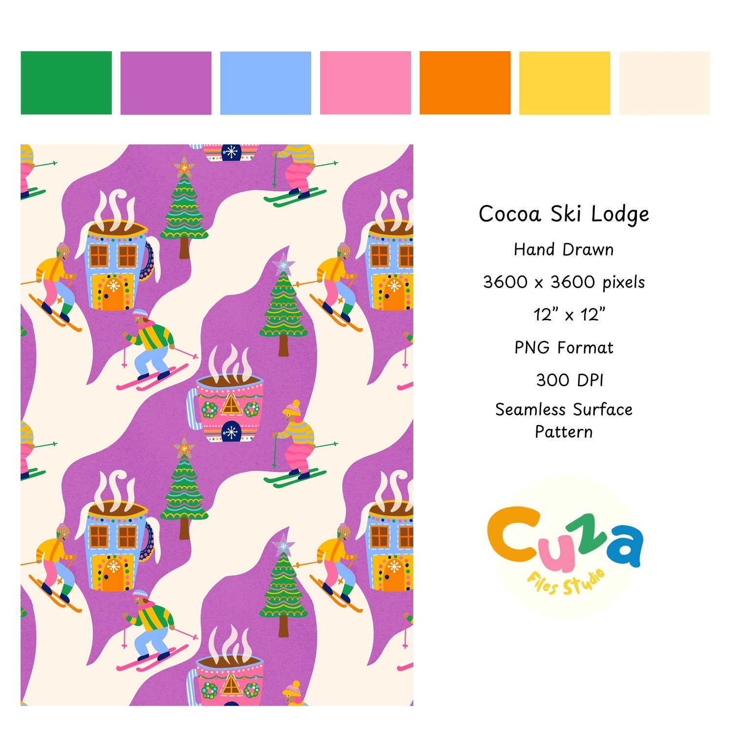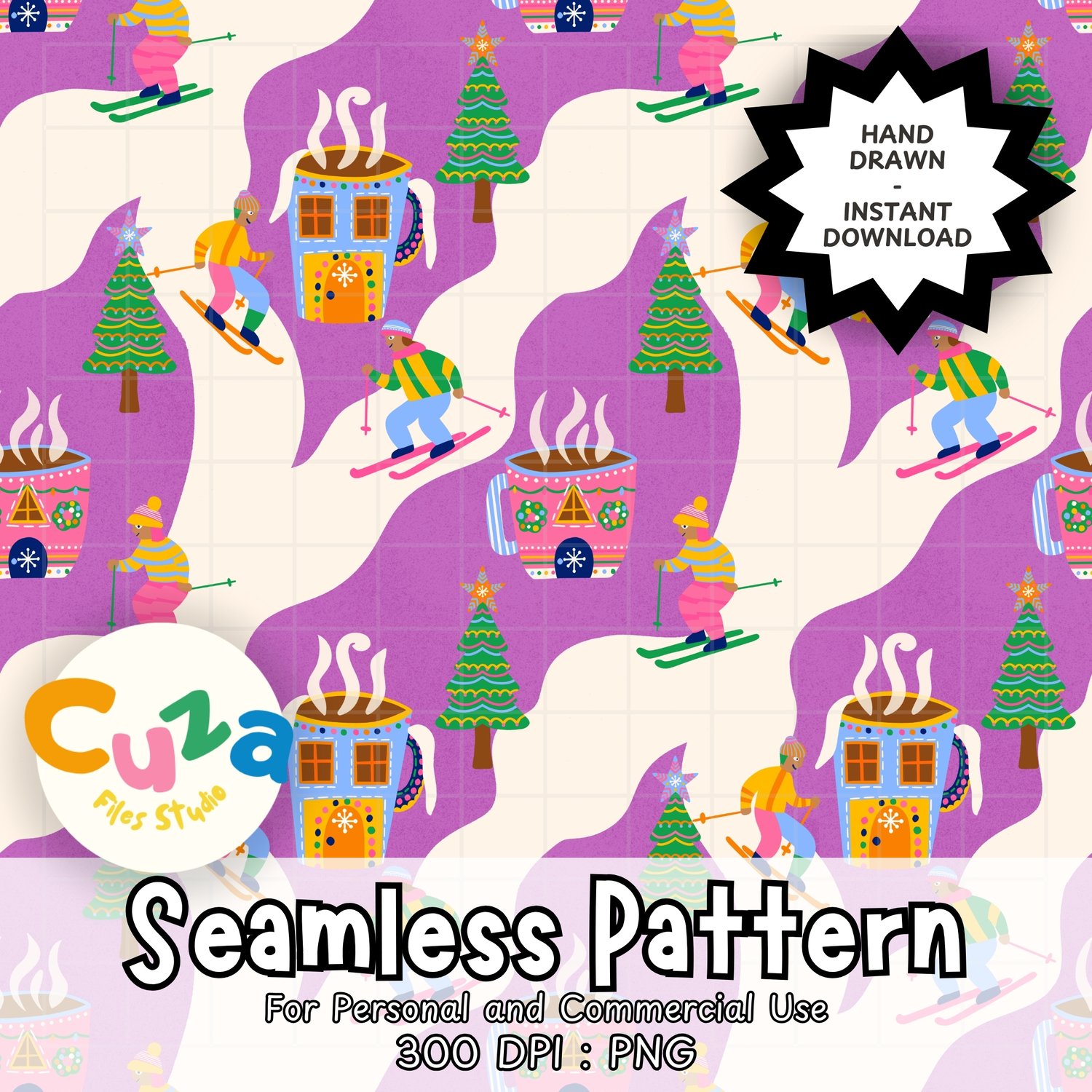 My playful pattern combines nostalgic christmas skiing with a beloved hot cocoa making it perfect for projects that celebrate the fun side of the holidays and bring a joyful feel that kids and adults will love.
