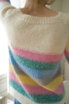 If substituting yarns, you need fingering weight yarn and laceweight mohair to be held together or DK weight yarn if using a single strand, approximately: 370 (415, 505, 600, 645, 735, 875, 965) yds / 335 (380, 465, 545, 590, 675, 800, 885) m MC, 185 (230, 230, 275, 275, 275, 325, 325) yds / 170 (210, 210, 255, 255, 255, 295, 295) m CC1 and CC2 and 95 (140, 140, 140, 140, 185, 185, 185) yds / 85 (125, 125, 125, 125, 170, 170, 170) m CC3, CC4 and CC5.