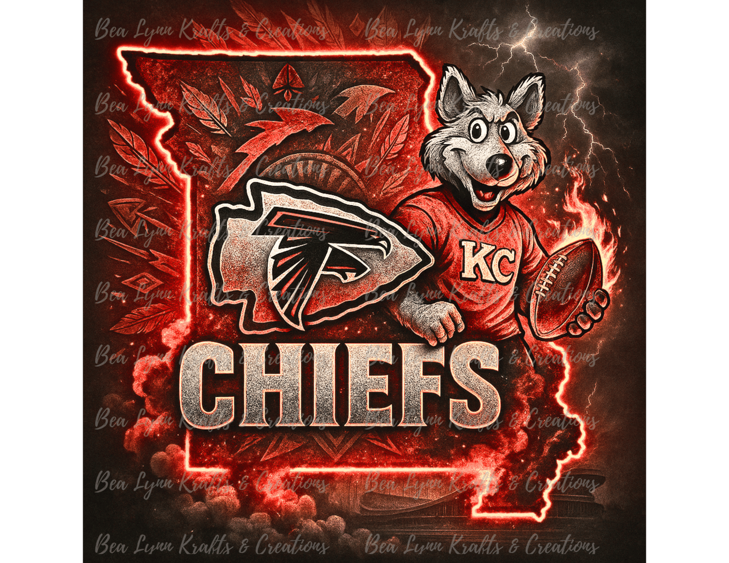 Light up your game day lineup with this Kansas City Chiefs State PNG – a bold fusion of Missouri pride and Chiefs fandom! This one-of-a-kind design showcases the full state of Missouri outlined in glowing red, filled with tribal-inspired art textures, smoke, lightning, and blazing energy. Taking center stage is KC Wolf, the Chiefs' iconic mascot, suited up and holding a flaming football with his signature grin.