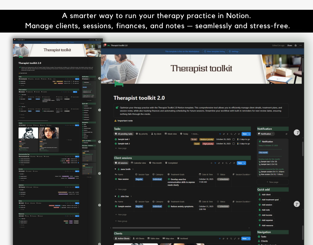 Whether you’re managing a large caseload or just starting your practice, the Therapist Toolkit Notion Template simplifies the administrative side of therapy, giving you more time to focus on what matters most—helping your clients.