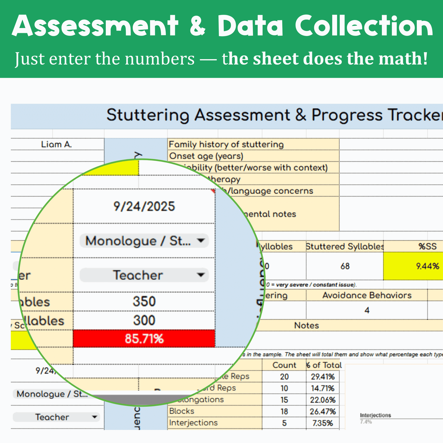 ✔ %SS Done for You – Enter total and stuttered syllables and the sheet instantly calculates %SS.