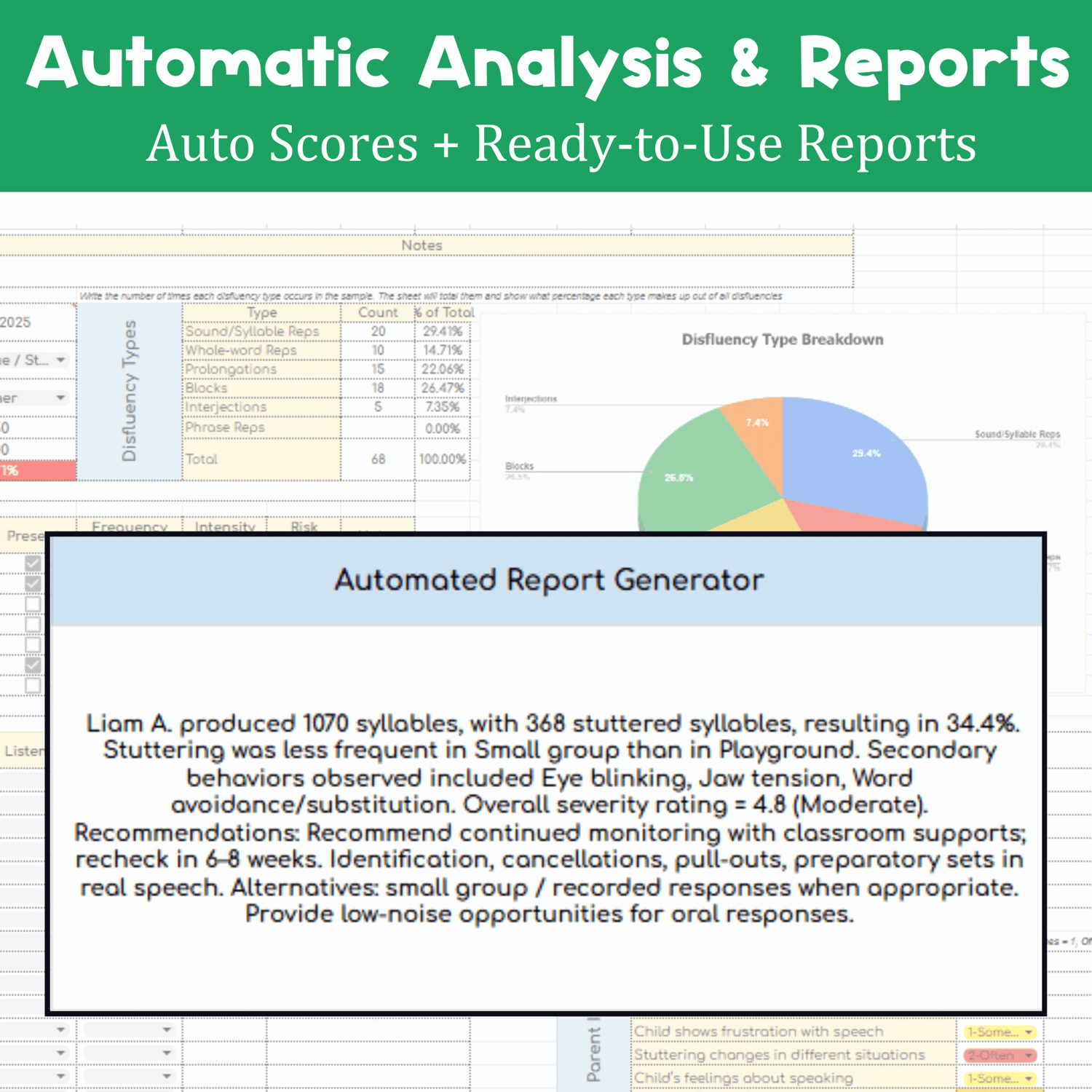 ✔ Behaviors & Disfluencies Auto-Compiled – Check boxes or add counts, and the sheet organizes the data into neat summaries.