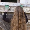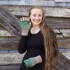 The On the Farm Fingerless Mitts design references the millions of acres of farmland covering the state of Montana. You look down the rows: clear, straight, and neatly planted. Close to you, the rows are well-defined. You can see the dirt and the stalks. But as you look up and into the distance, the rows start to blend together, becoming a vast sea of green, bushy crops. The colorwork reflects this visually, as the rows of MC gradually fade into the CC as you reach the top of the mitt.