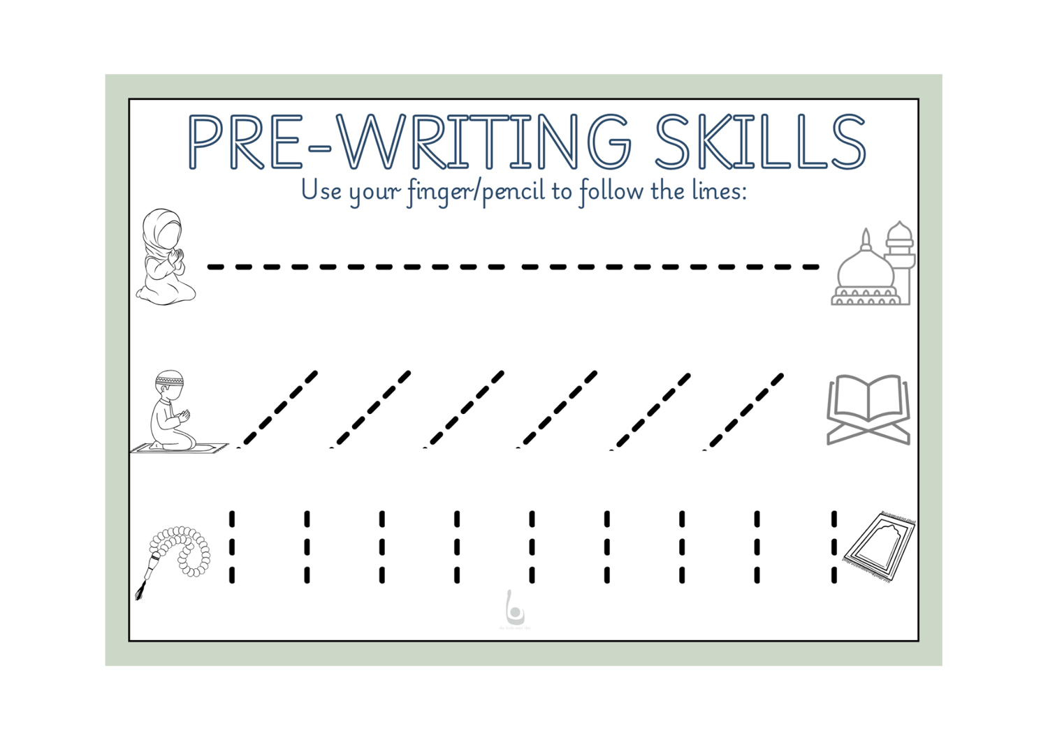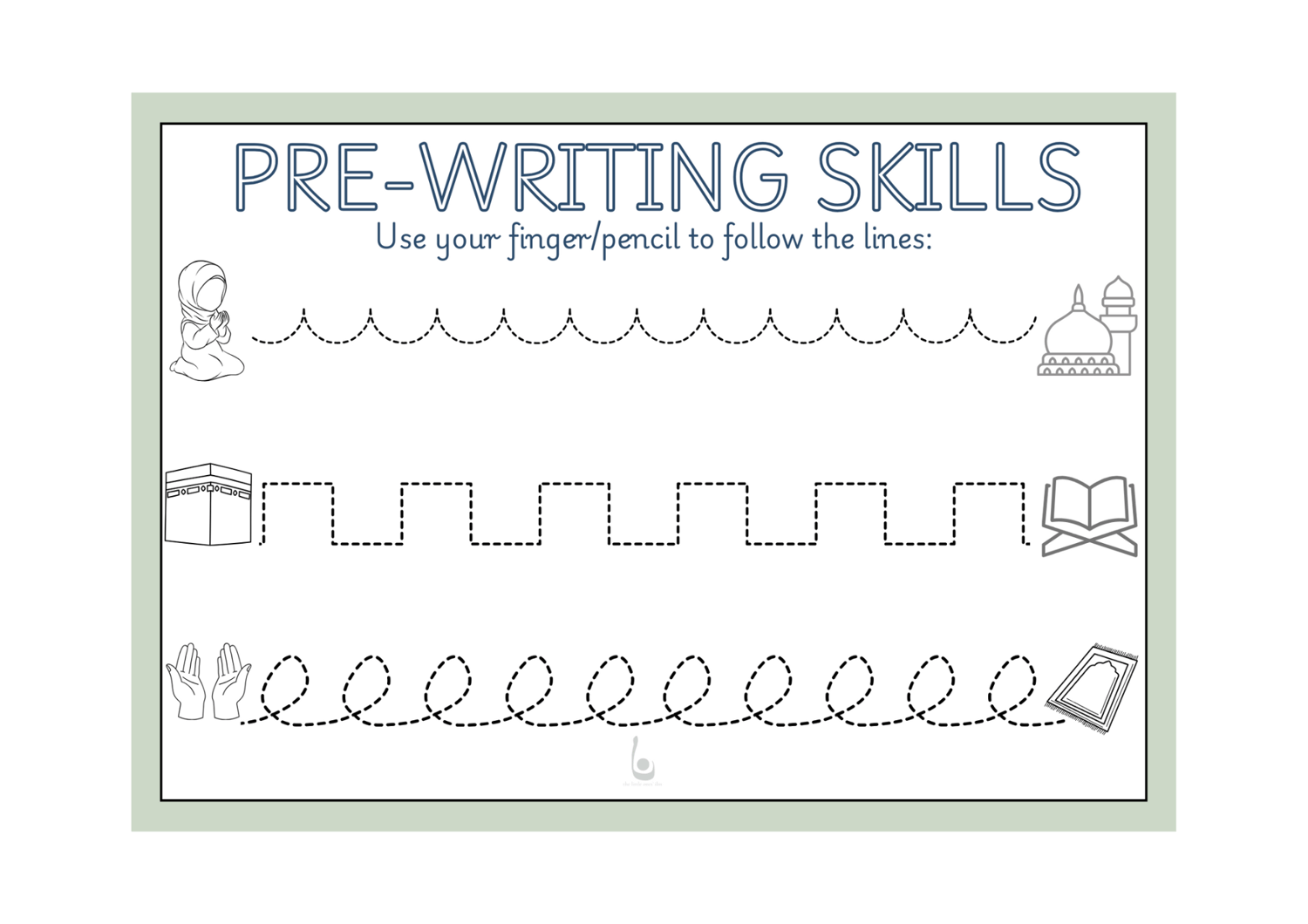 An engaging pre-writing worksheet featuring islamic-themed pictures to help little ones develop fine motor skills and pencil control. These sheets can be laminated and used with fingertips first before pen control.