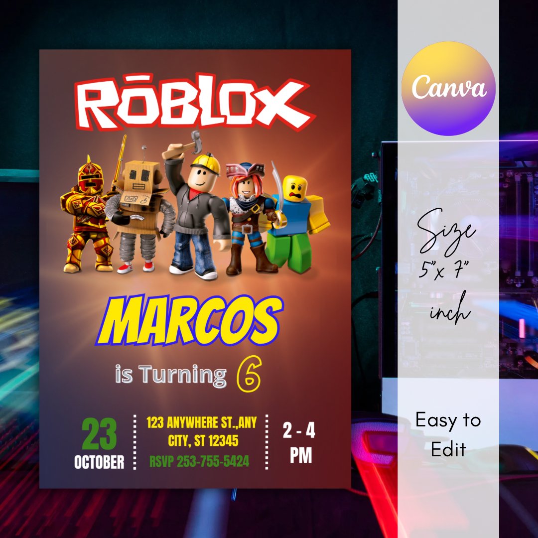 Celebrate your gamer’s big day with this Roblox birthday invitation! Editable and easy to personalize with name, age & details. Perfect for boys or girls, digital download, print at home or share online. Fun Roblox design for an unforgettable party! 🎮