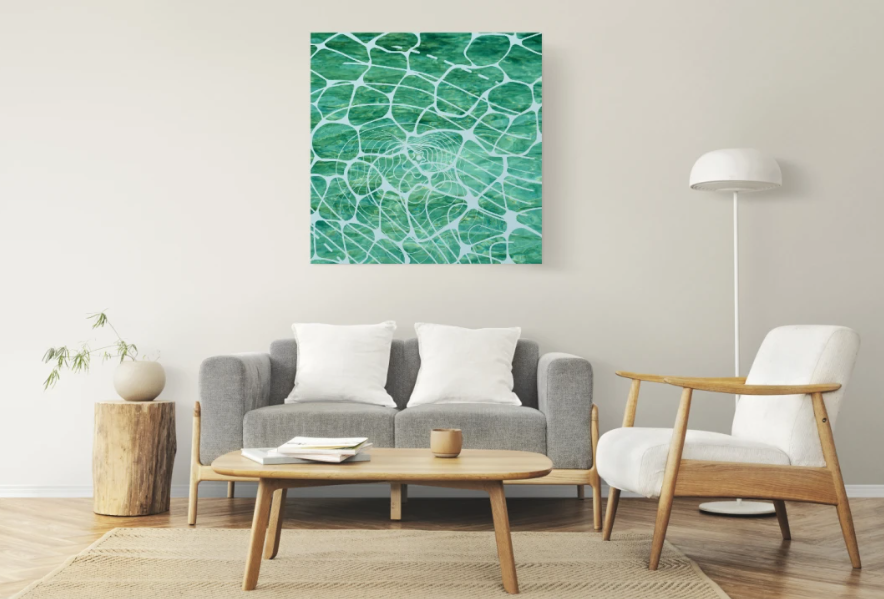 Use Ebb & Flow as a visual meditation tool by focusing on the central dot. This focal point, combined with teal’s calming frequency, helps synchronize your mind and body. As you gaze, take deep breaths and imagine the calming teal frequency reaching every cell in your body, promoting calm, balance, and a subtle energy boost.