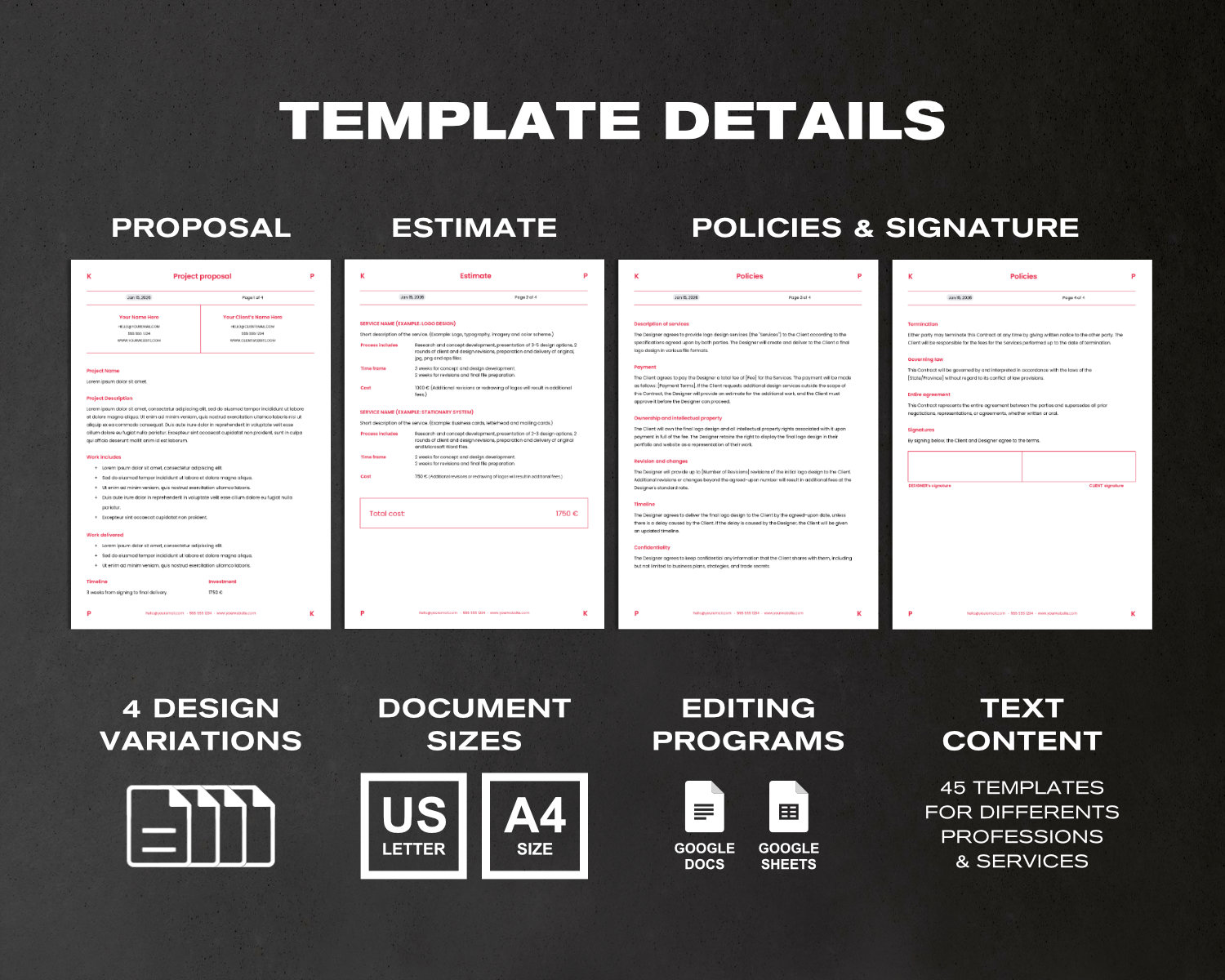 · 45 text templates for different professions and services.