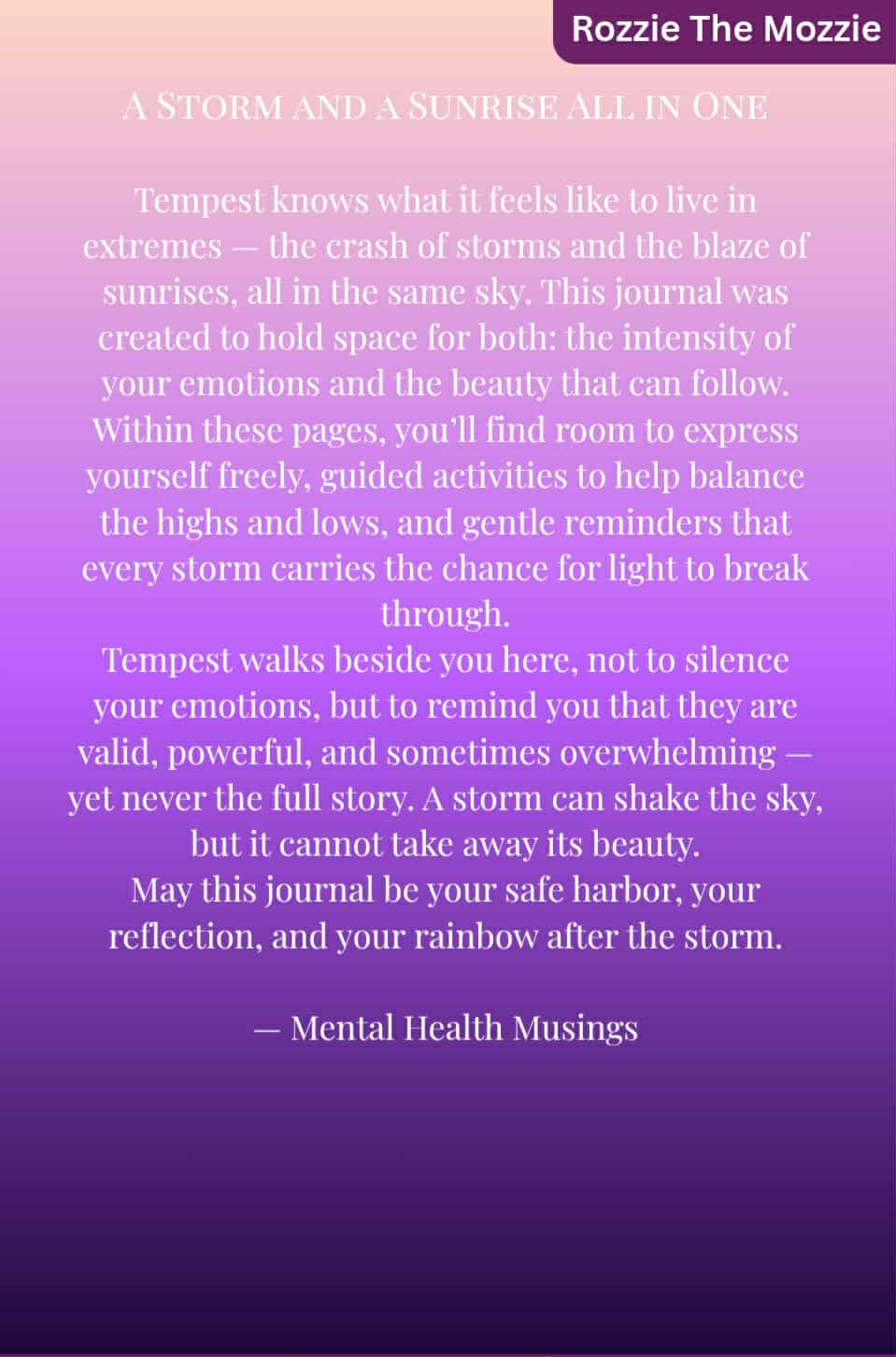 Tempest understands what it feels like to ride the waves of Borderline Personality Disorder — intense emotions that crash like storms, yet shine as brightly as a sunrise. This journal was created as a safe space for you to explore those feelings, capture the highs and lows, and find balance in between.
