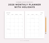 2028 Monthly Planner with Holidays, Printable & Fillable, A4/Letter Size