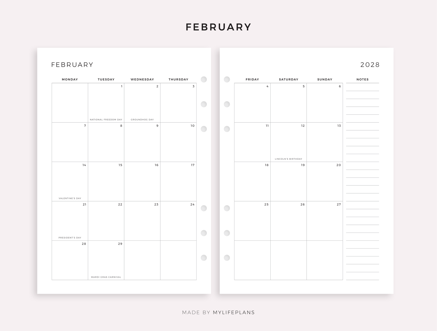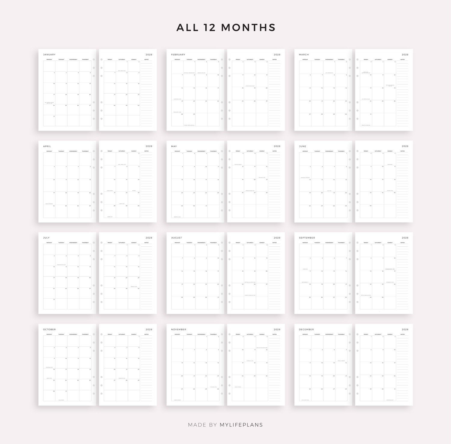This is a printable 2028 monthly planner with holidays — just download, print, and start using it right away.