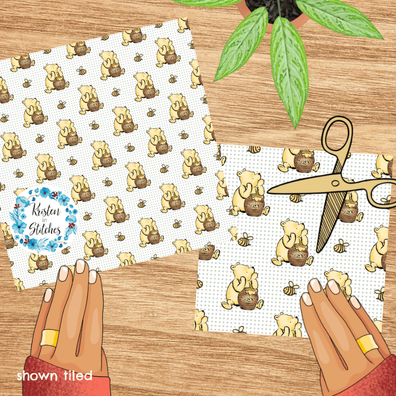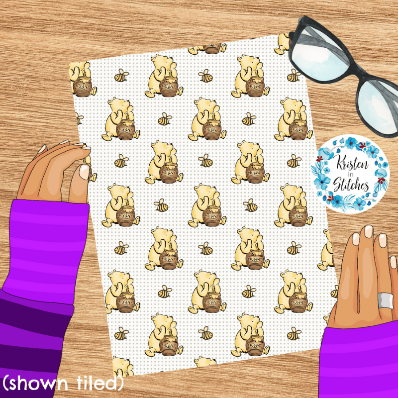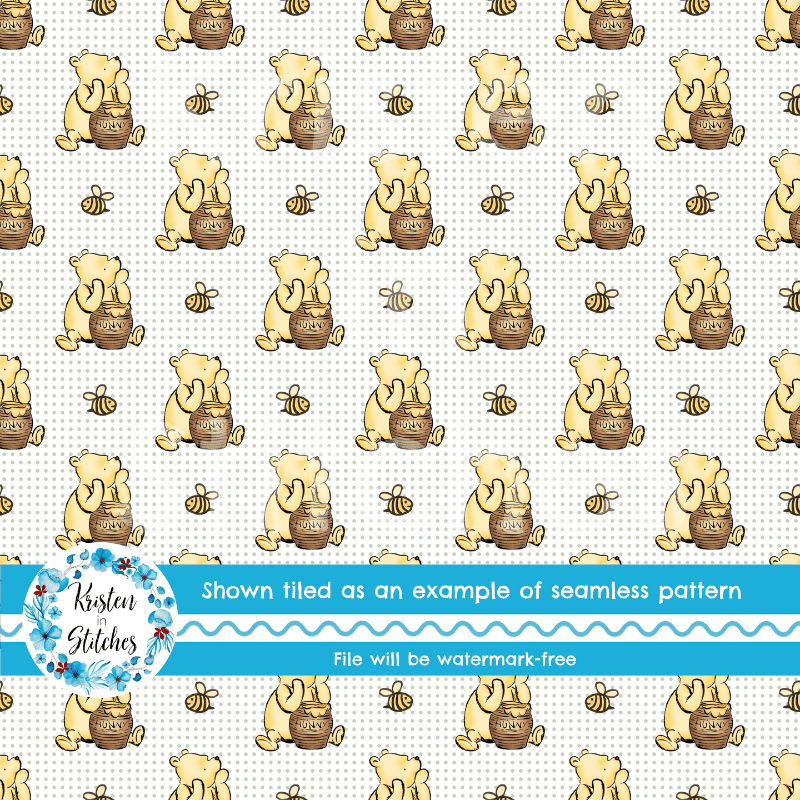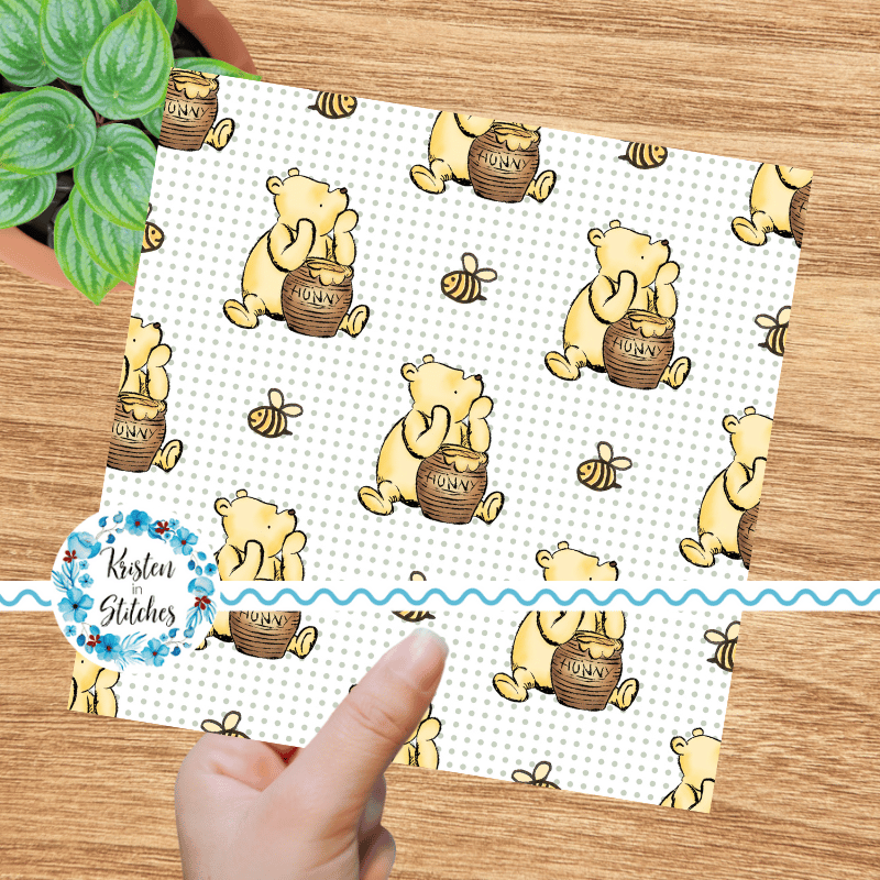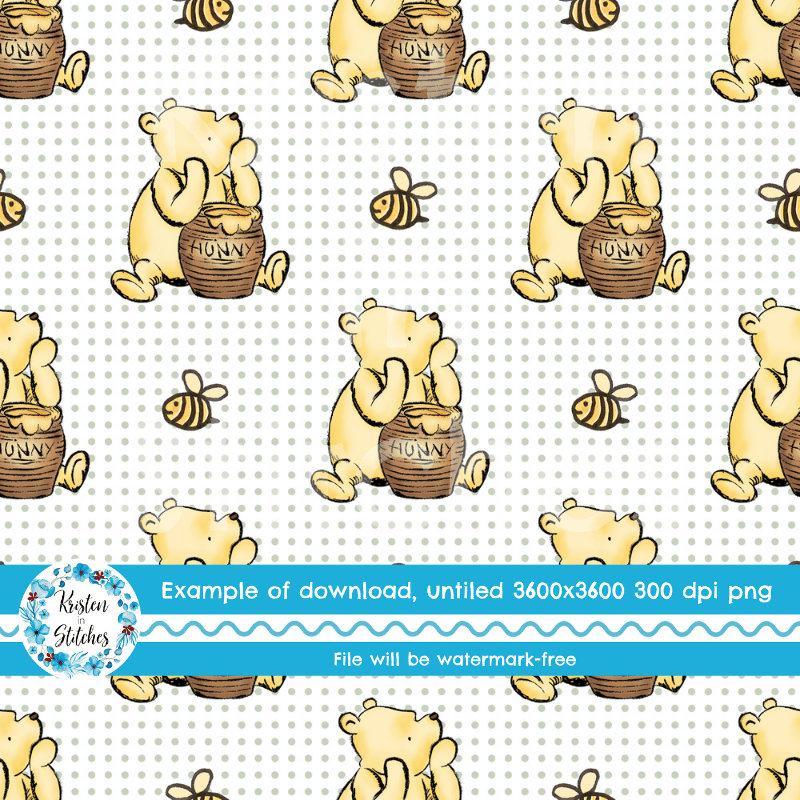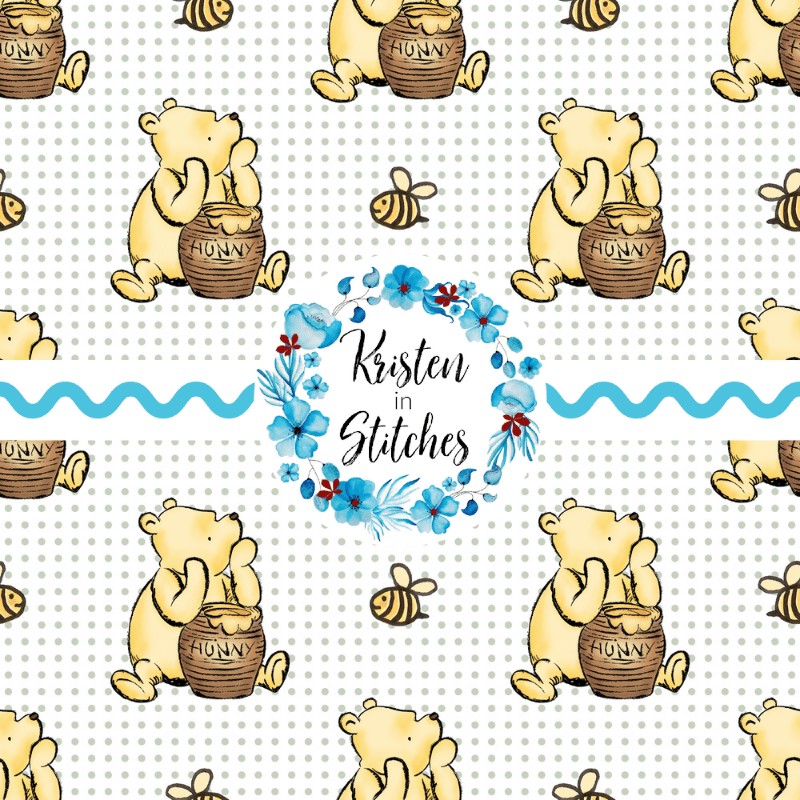 Classic Pooh with his hunny pot and bumblebees with sage green dots.