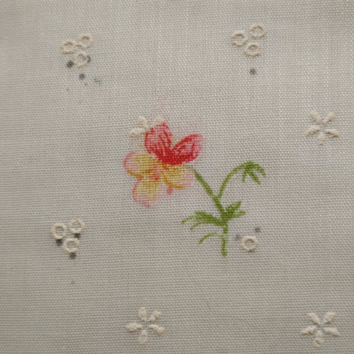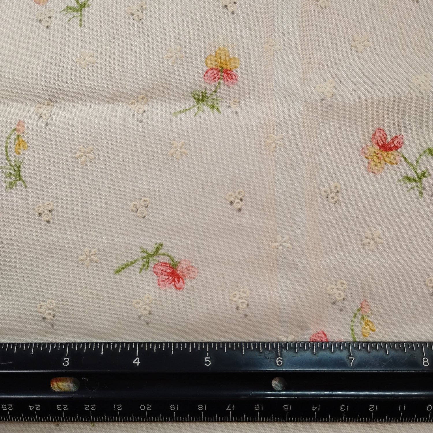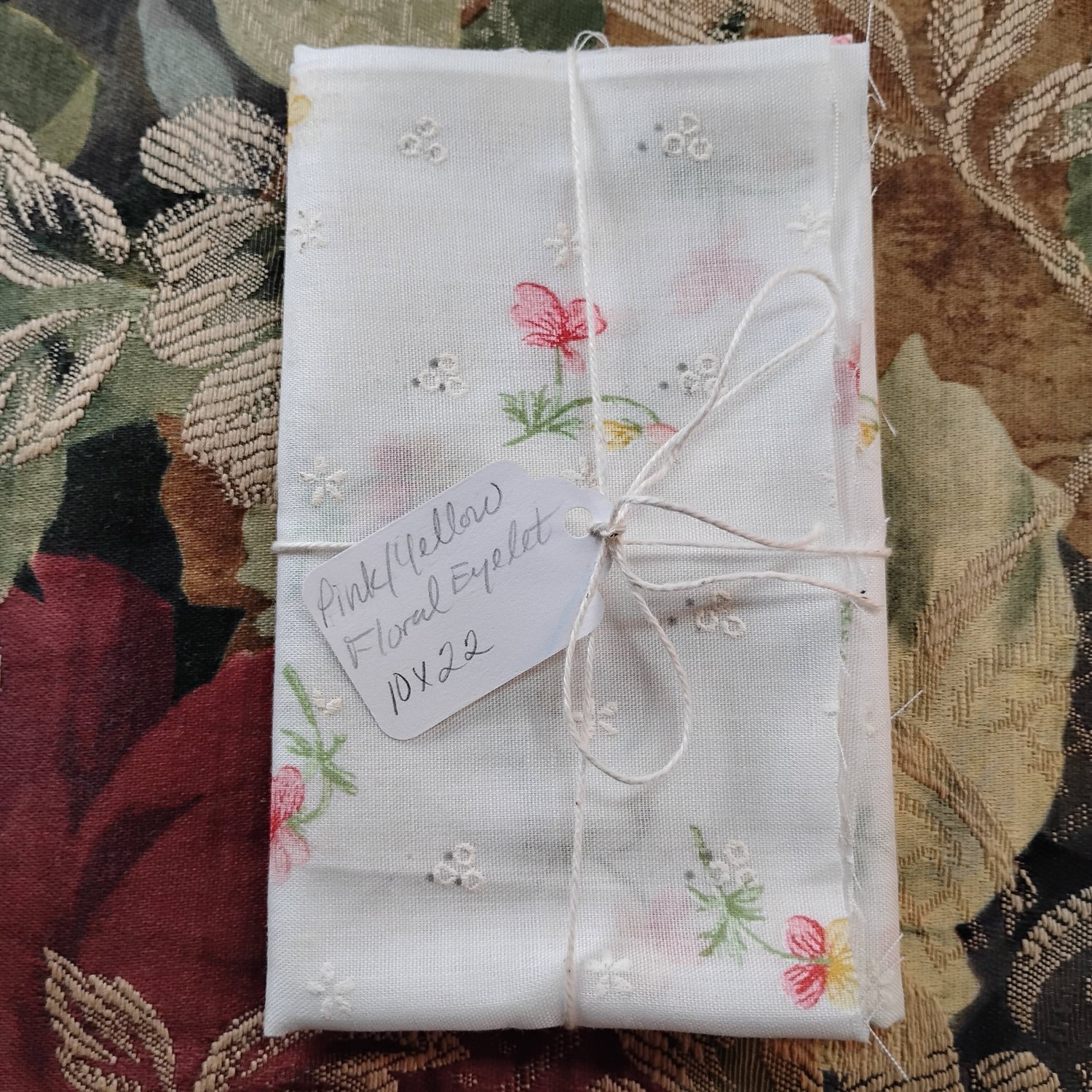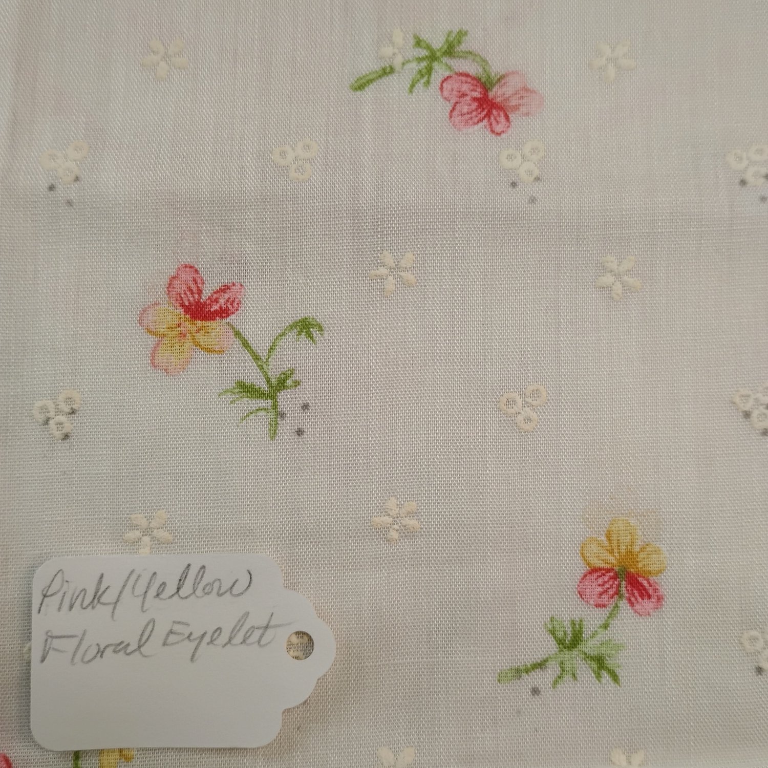 An eyelet with an all-over pink, yellow and green floral pattern.