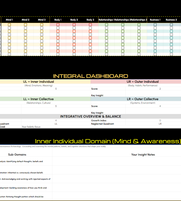 Structured worksheets for Mind, Body, Relationships, and Systems that help you record insights, identify patterns, and map your upgrades. This is where scattered thoughts become actionable intelligence.
