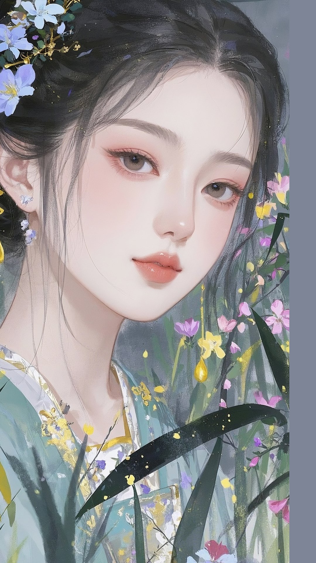 This work is a beautiful oriental portrait created using modern digital art techniques. The light pastel colors and vivid flower coloring are in exquisite harmony, and the contrast with the subdued tone of the background brings out the leading lady. Yellow accents (earrings and flowers) also add rhythm to the composition. The subject's face is placed in the center of the screen, and the eye is drawn naturally toward the subject's eyes. The flowers and leaves intersect in the background, creating a sense of depth without being flat. The woman's expression is very delicate, and her calm and slightly melancholy gaze stirs the emotions of the viewer. The smooth skin and exquisite brushwork unique to AI create a charm that moves between illustration and realism.