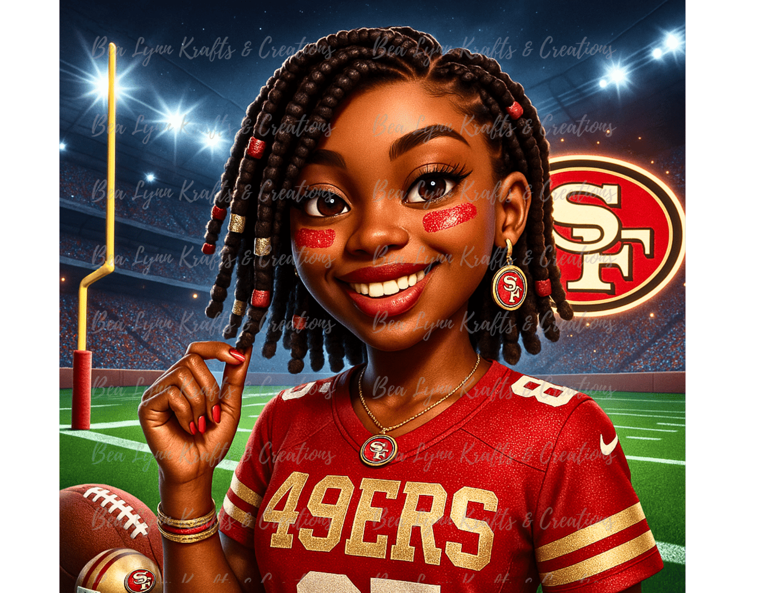 - Features a smiling Black girl with braided hair, 49ers jersey, earrings, and face paint