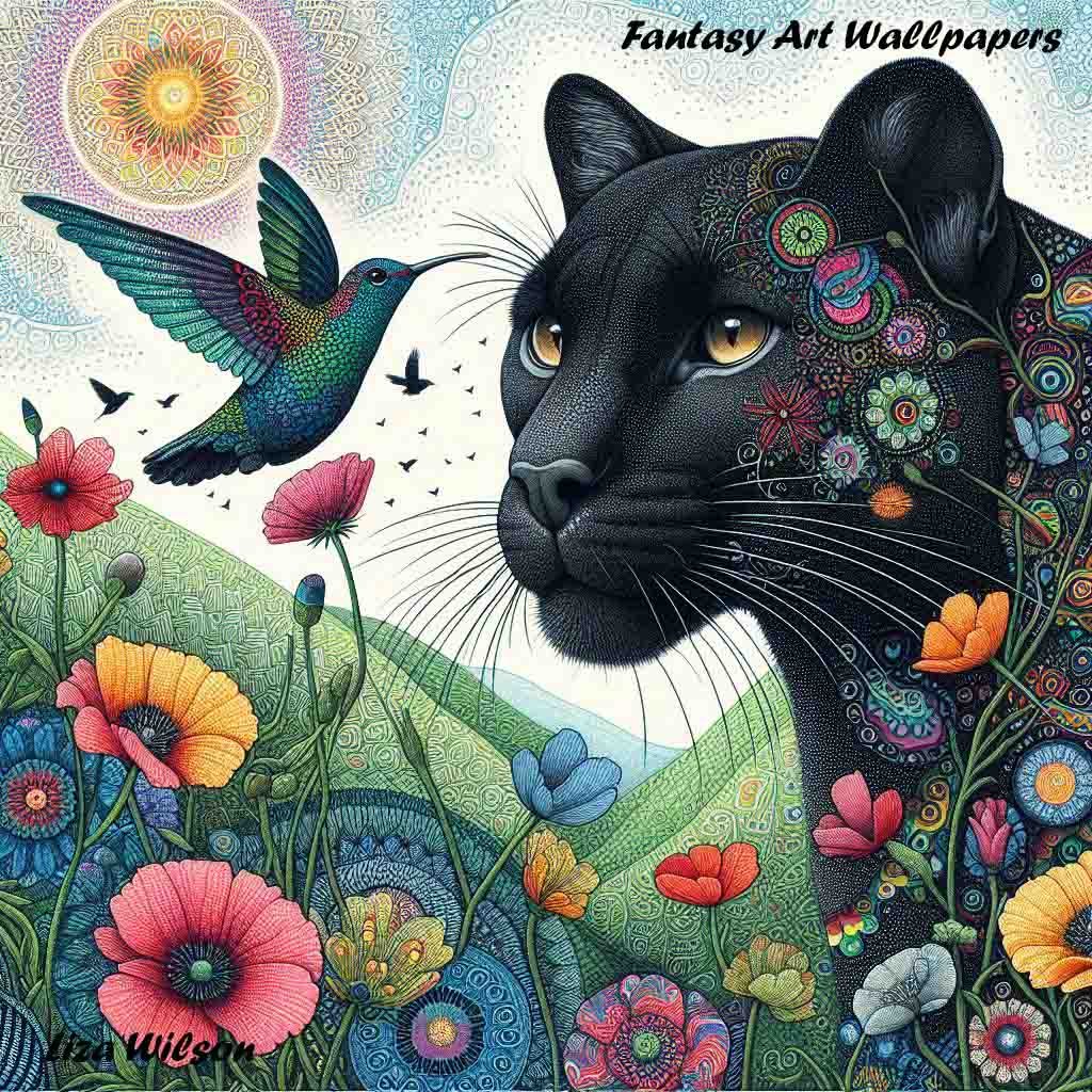Black Puma close up on green hills with flowers & humming birds. Spirograph style.
