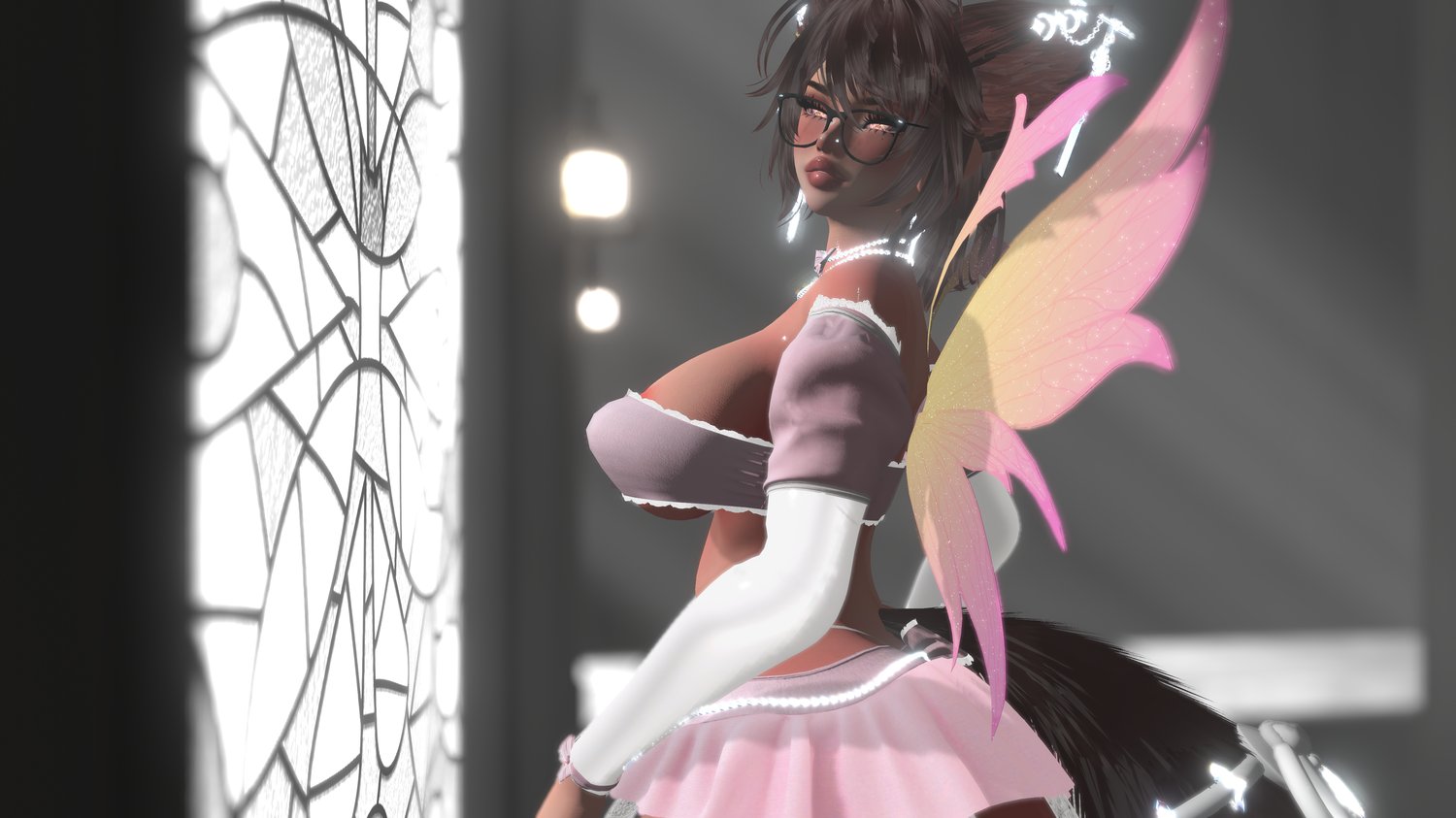 Rings, Earrings, Glasses, Bodysuit with Transparency adjuster, Fox Ears, Fox Tail, Fairy Wings, Thong, Choker, Bracelet, Bow Necklace, 2 Skirts, 2 Shirts, 2 Gloves, 2 Shoe Options, & 2 Preset Outfit Options.