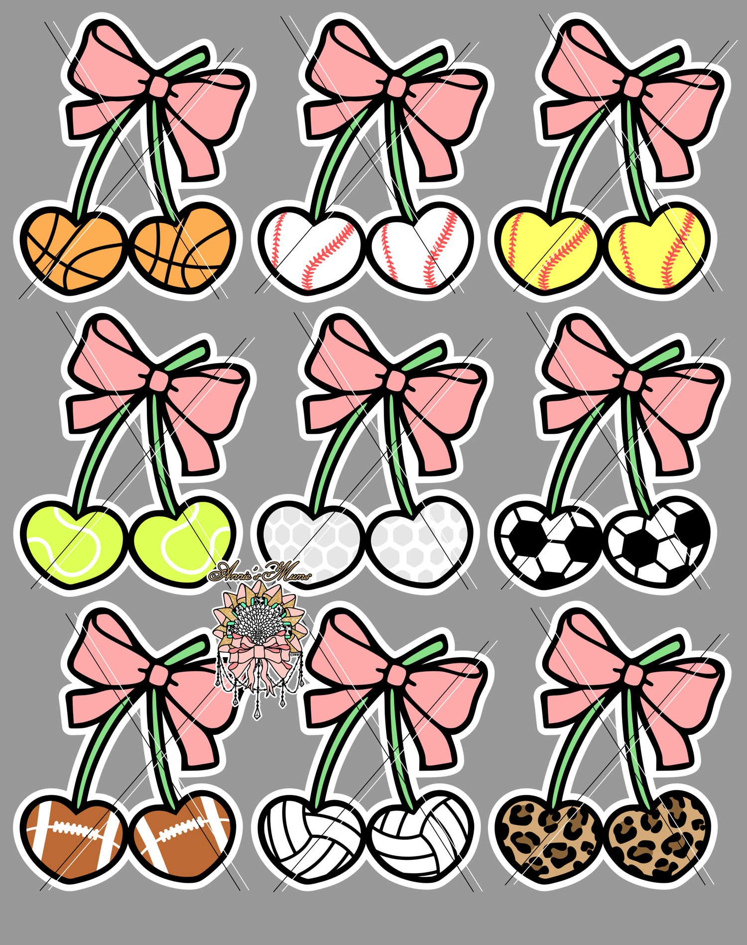 Bring the sweetest game-day style to your creations with these coquette-inspired sports cherries! Each design features heart-shaped sports balls tied with a pretty pink bow, bringing in a fun mix of team spirit and trendy style.