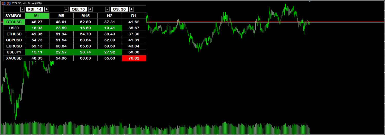 - Displays RSI values for all market watch symbols and selected timeframes.