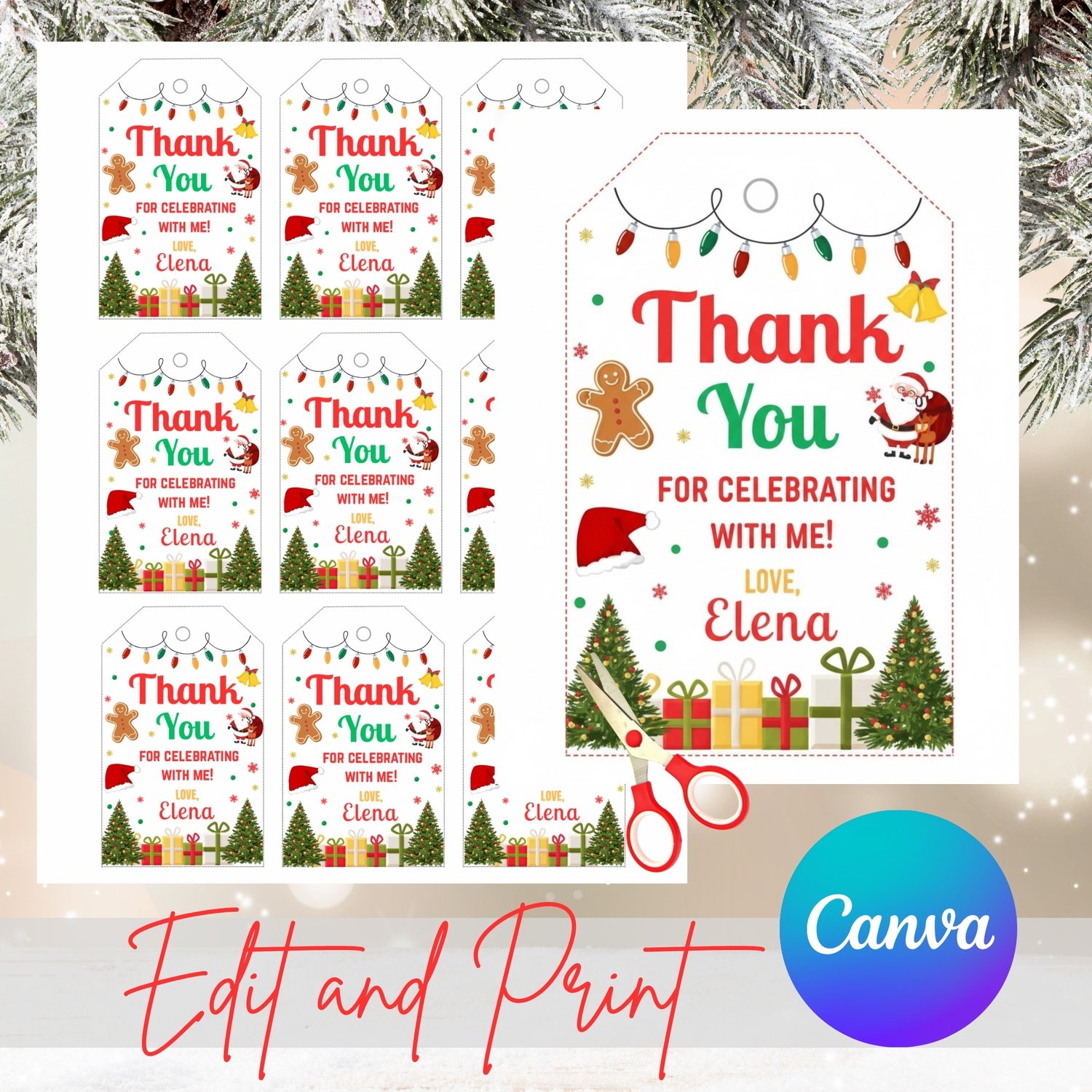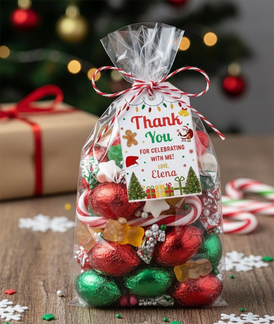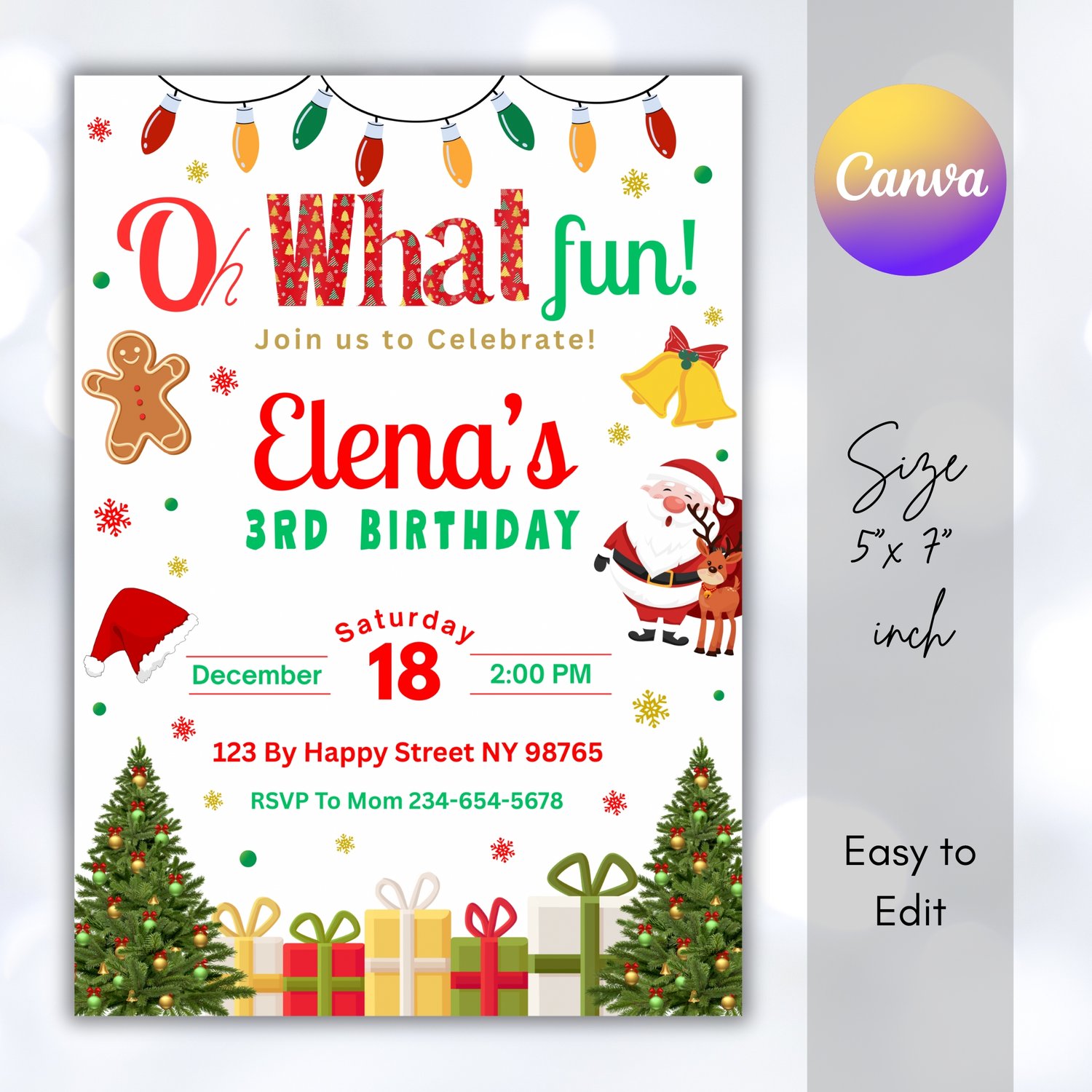 This festive Christmas Birthday Invitation and Thank You Tag set is perfect for holiday-themed parties. Featuring cheerful red and green colors, snowflakes, and Christmas lights, it adds a joyful touch to your celebration.