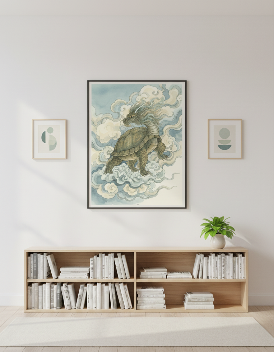 This captivating Chinese Prosperity Art showcases the legendary Dragon Tortoise, a powerful symbol in Feng Shui known for its auspicious spiritual presence. It is believed to attract wealth, bring good fortune, and offer protection, making it an ideal addition for anyone seeking to enhance their living space with meaningful mythical home decor. Embrace the ancient wisdom and positive energy this digital image brings, transforming your environment into a sanctuary of prosperity and abundance.