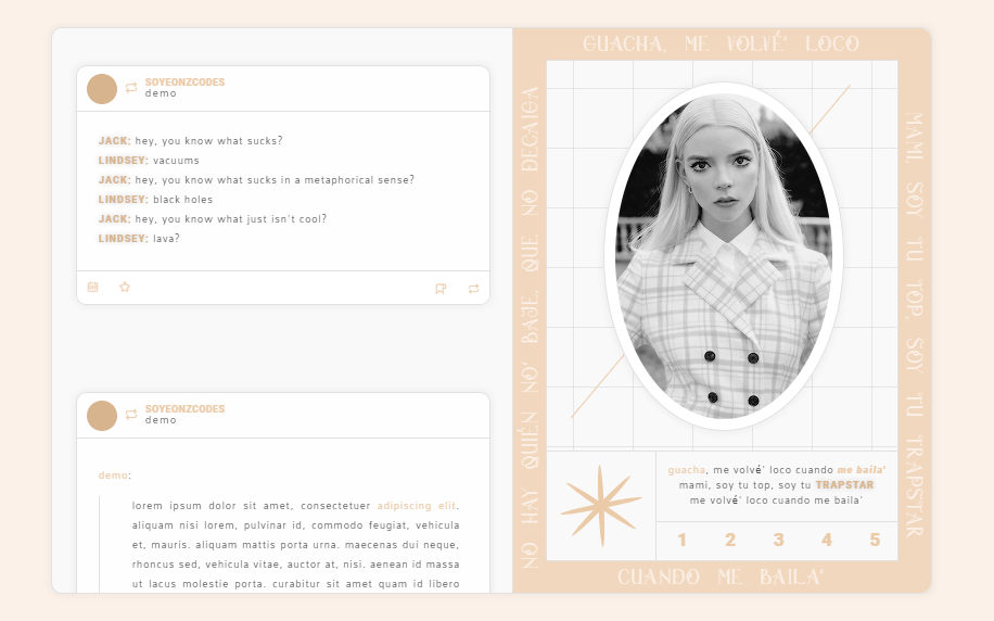 a big shout out to my moon and stars dione ( @reveluvgifs ) because she helped me with the whole creative process of the navigation page and literally without her advice i couldn't have finished this theme! gracias, mi solcito ♡