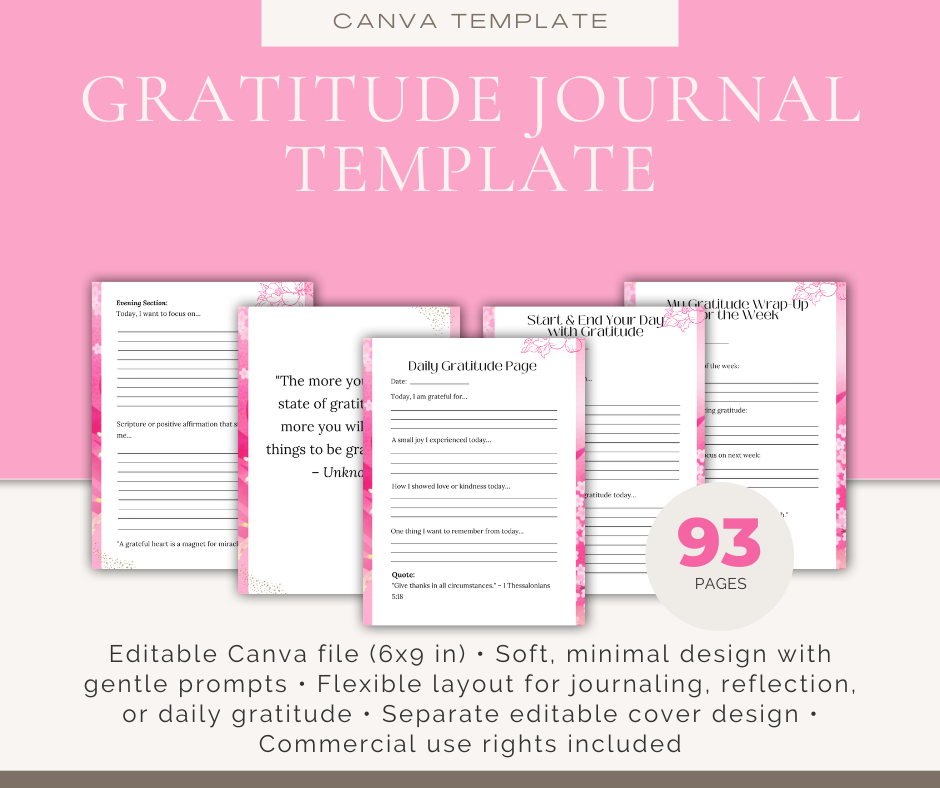 What’s Included: • Editable Canva file (93 pages, 6x9 in) • Soft, minimal design with gentle prompts • Flexible layout for journaling, reflection, or daily gratitude • Separate editable cover design (front & back) • Commercial use rights included