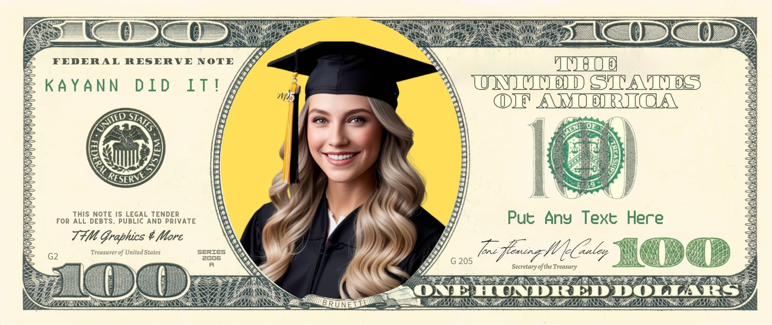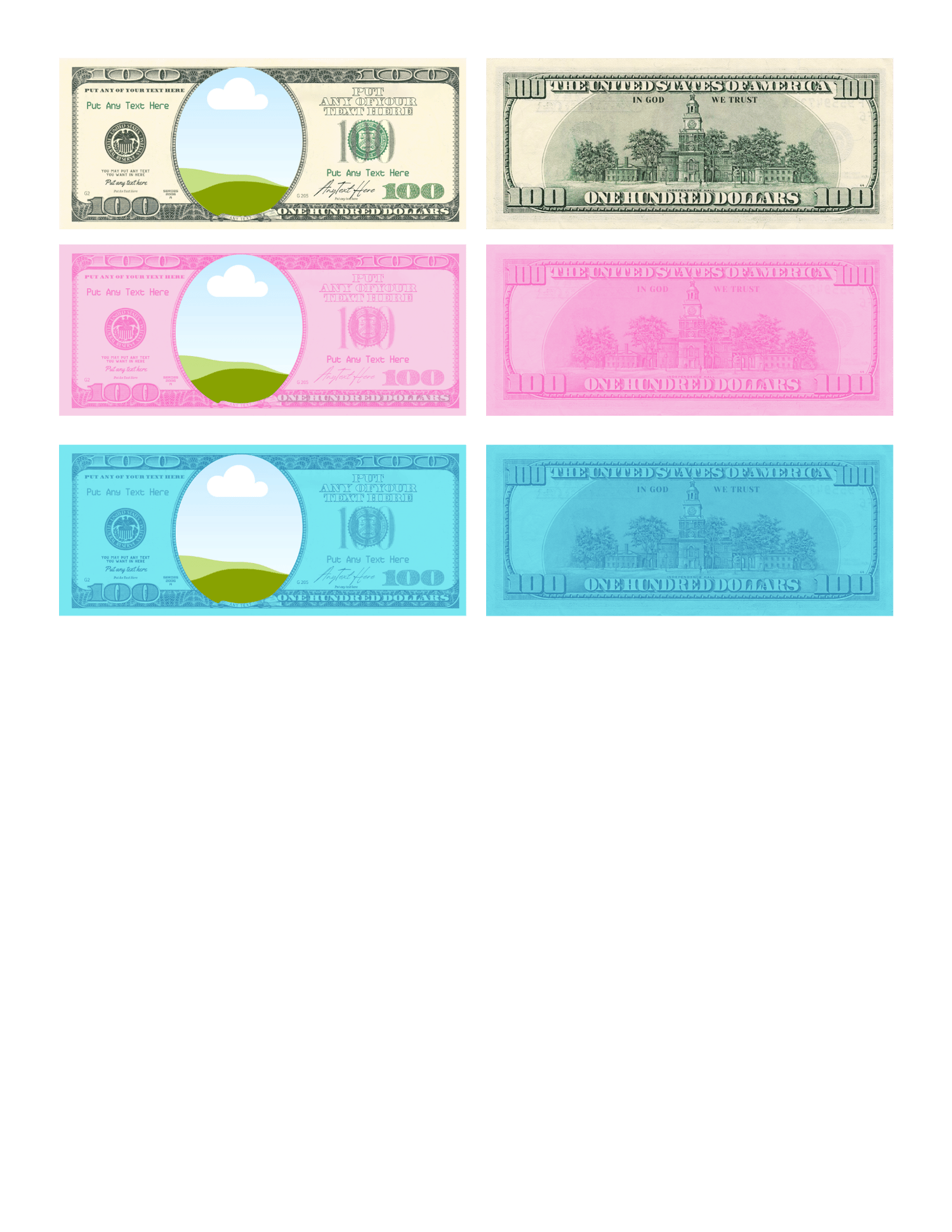 This Canva editable template comes with 3 different 100 dollar bills; a green, a blue, and a pink (front and back). Simply download, make a copy, and change info to your desired wording, change pics, etc. Make it your own. It's simple and easy to edit in Canva.